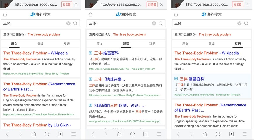 近日,搜狗將英文搜索全面升級(jí)為海外搜索,旨在幫助不精通英文的中國人搜索和閱讀全世界的醫(yī)療、科技及人文信息。用戶無論輸入中文還是英文,搜索結(jié)果在英文原文呈現(xiàn)外,新增了中文翻譯、中英雙語兩大頁面,服務(wù)于不精通英文的用戶。這是搜狗把深度神經(jīng)元網(wǎng)絡(luò)翻譯系統(tǒng)與搜索相結(jié)合打造的全新產(chǎn)品,也是全球首個(gè)提供功能的搜索引擎。(美通社,2017年1月17日北京)