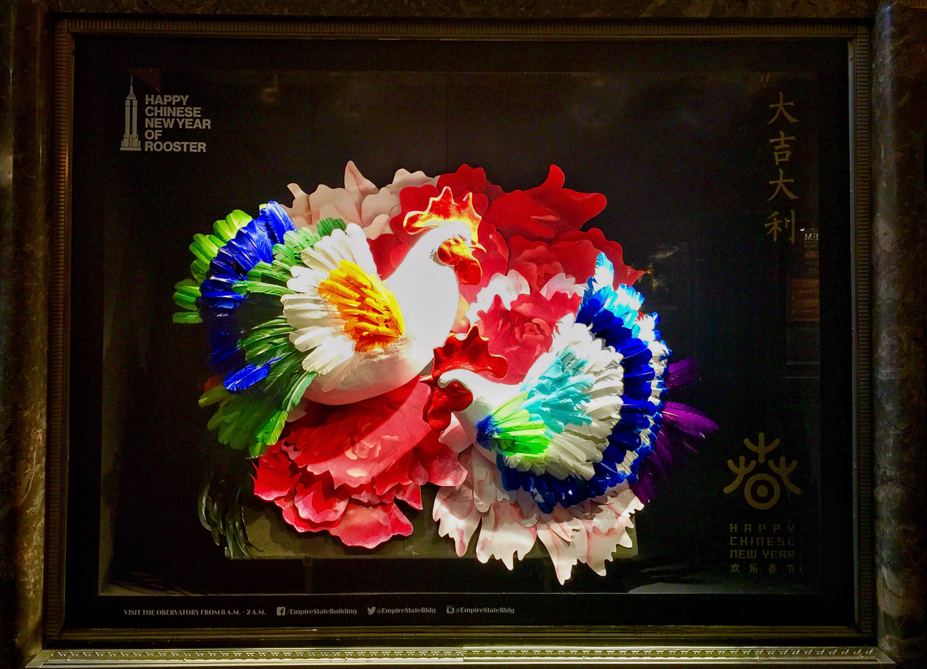 為慶祝雞年春節的到來,帝國大廈將專為中國農歷新年亮燈并進行新年倒數,并推出一年一度的春節櫥窗展,分別以“金雞報曉”、“大吉大利”、“金雞納福”為主題,為觀眾呈獻融合當代特色的立體中國年畫。2017年1月26日至27日,專為中國農歷新年打造,由中央美術學院設計的“普天同慶”新春燈光秀將于帝國大廈舉世聞名的塔頂特別呈現。(美通社,2017年1月24日紐約)