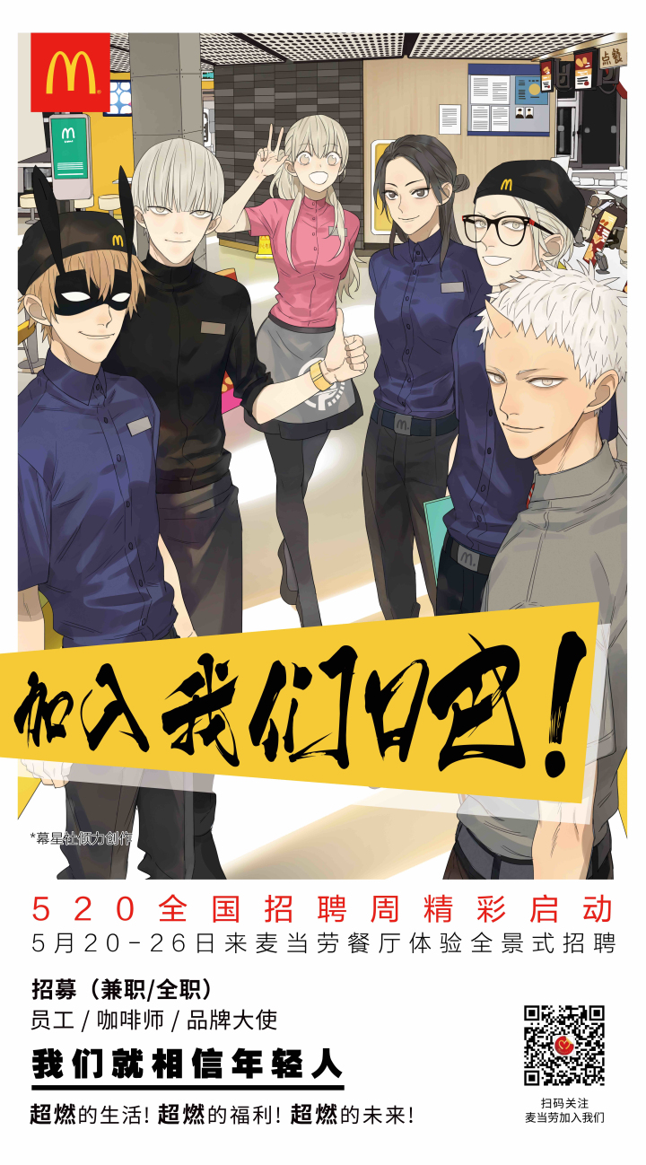 麥當(dāng)勞中國(guó)于5月20日啟動(dòng)2017年全國(guó)招聘周。從5月20日到26日間指定時(shí)段,求職者前往全國(guó)2400家任意一家麥當(dāng)勞餐廳,即可體驗(yàn)全景式招聘,最快24小時(shí)極速入職。520全國(guó)招聘周期間,求職者可在指定時(shí)段到任意一家麥當(dāng)勞餐廳,在品牌偶像帶領(lǐng)下參觀工作和休息場(chǎng)所,了解麥當(dāng)勞的企業(yè)文化、培訓(xùn)項(xiàng)目、職業(yè)發(fā)展路徑以及員工激勵(lì)活動(dòng)。