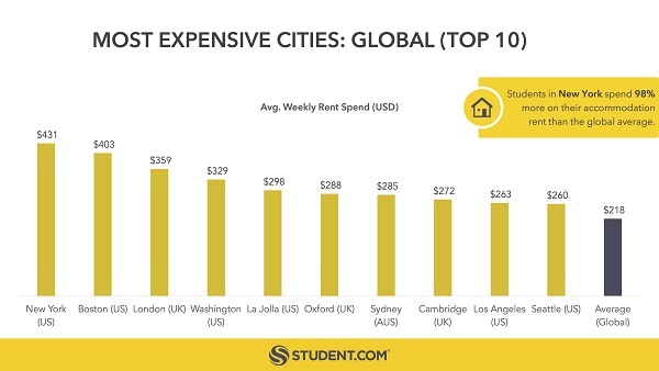 全球最大的學(xué)生住宿平臺(tái)student.com發(fā)布了一份全球?qū)W生住宿指數(shù)報(bào)告。報(bào)告發(fā)現(xiàn),對(duì)學(xué)生而言,房租最貴的城市分別是紐約、波士頓和倫敦,而最便宜的三個(gè)城市都在美國(guó)境內(nèi),分別是奧本、阿森斯和塔拉哈西。這份排名是student.com根據(jù)其網(wǎng)站租房數(shù)據(jù)得出的。在紐約的學(xué)生每周花在住宿上的開(kāi)銷(xiāo)達(dá)431美元,比全球平均水平高出98%。(美通社,2017年5月22日倫敦)