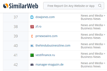 此外,PRNewswire.com在最近公布的Similar Web商業(yè)新聞網(wǎng)站排名中位居第39位,是企業(yè)新聞稿發(fā)布領(lǐng)域的最好名次,一同上榜的網(wǎng)站還有華爾街日?qǐng)?bào)(5位),經(jīng)濟(jì)學(xué)人(18位)和道瓊斯(37位)等。