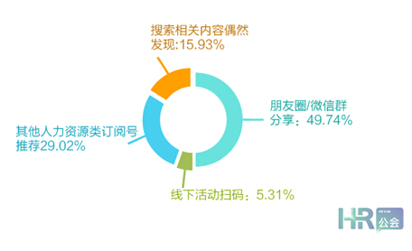 參與調研的人群中,人力資源專員/主管占比68.36%,人力資源經理/總監及以上級別占比31.64%,其中有49.74%的受訪者表示通過朋友圈獲取人力資源相關信息的。看來,朋友圈除了提供“點贊之交”外,還是分享知識的重要平臺。