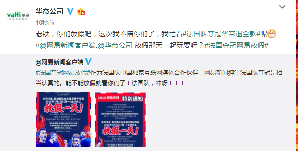隨著法國隊和克羅地亞隊進入到世界杯決賽,圍繞世界杯所進行的全民狂歡也進入到了最高潮階段。先是蒙牛“我不是天生強大,我只是天生要強”,然后有華帝“法國隊奪冠華帝退全款”,不斷激發(fā)了全民參與的積極性。7月12日,一直“各有態(tài)度”的網(wǎng)易也加入其中,“法國奪冠網(wǎng)易放假”成為今天的社交媒體新熱點。