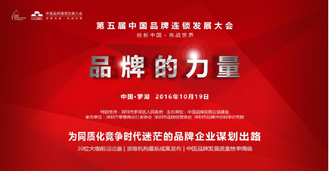 2016年10月19日,第五屆中國品牌連鎖發展大會將在深圳羅湖區君悅酒店舉行,逾千名國內外連鎖品牌及相關領域企業家、高管、專家及相關政府、媒體人士將會聚一堂,共襄盛事。韓都衣舍創始人趙迎光、名創優品全球聯合創始人葉國富、益普索亞太區CEO劉立豐、英融集團董事長雷彬、中國品牌發展公益基金首席專家周云等將在大會作主題分享。