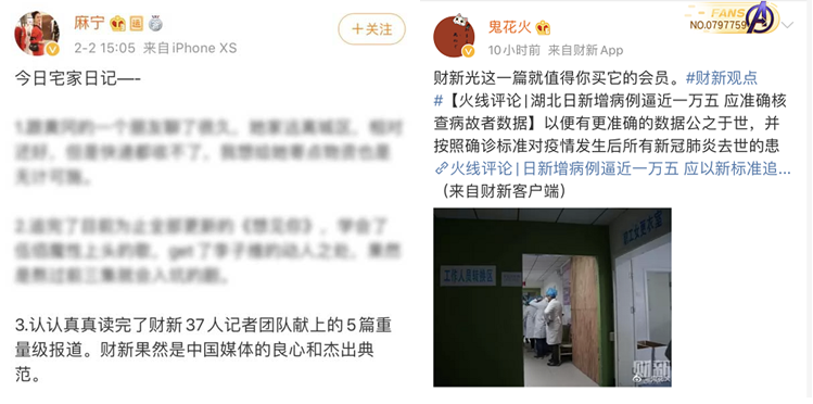 在新冠肺炎疫情的報道過程中,以財新為代表的部分媒體體現(xiàn)出專業(yè)新聞媒體的責(zé)任與擔(dān)當(dāng)。重大事件的報道,財新團隊從不缺席。網(wǎng)友這樣評論他們:
