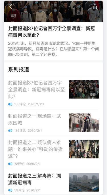 財新是最早關(guān)注疫情的媒體之一,并多維度解讀,包括頭條重磅、解藥系列、數(shù)據(jù)解析、肺炎日記、實時地圖等。隨著疫情升級為全國重大公共事件,財新對疫情取消閱讀“付費墻”,讓公眾了解及時、全面的疫情信息,這一舉措受到業(yè)內(nèi)和讀者贊許。