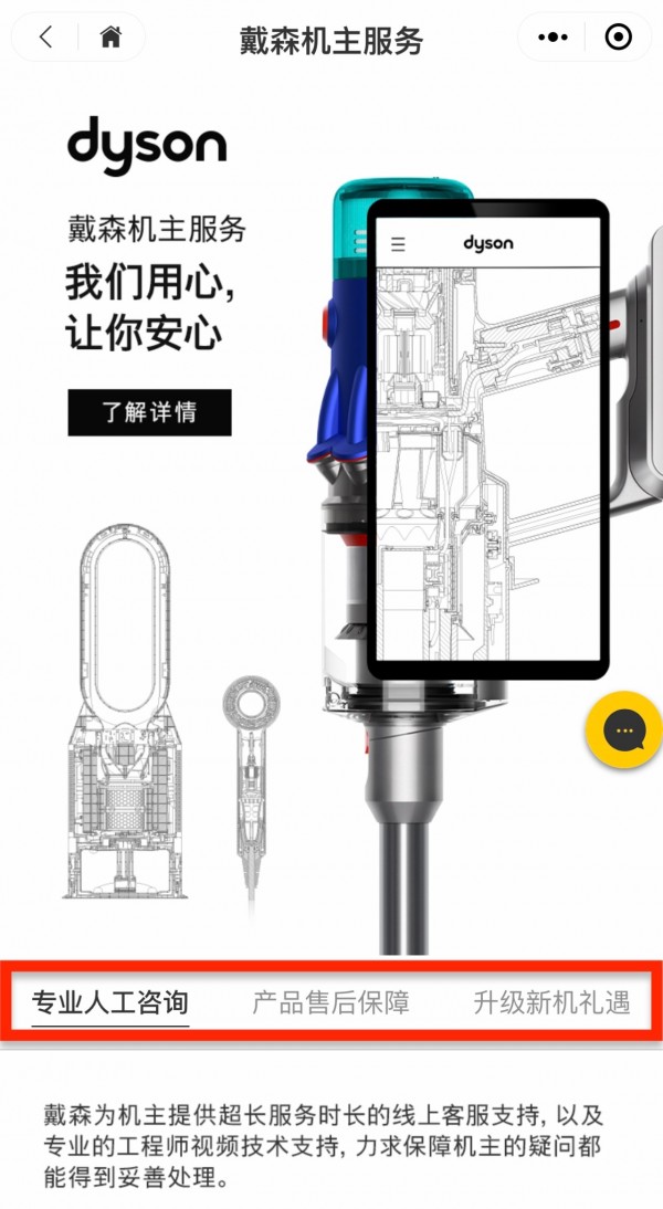 比如,為了方便用戶體驗,戴森把品牌實用信息和幫助指南、戴森官方微信旗艦店、官方售后服務、會員專享服務等一系列核心服務集結到Dyson小程序上。