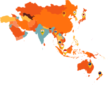澳大利亞、印度、印度尼西亞、日本、馬來西亞、新西蘭、巴基斯坦、菲律賓、韓國、泰國、越南