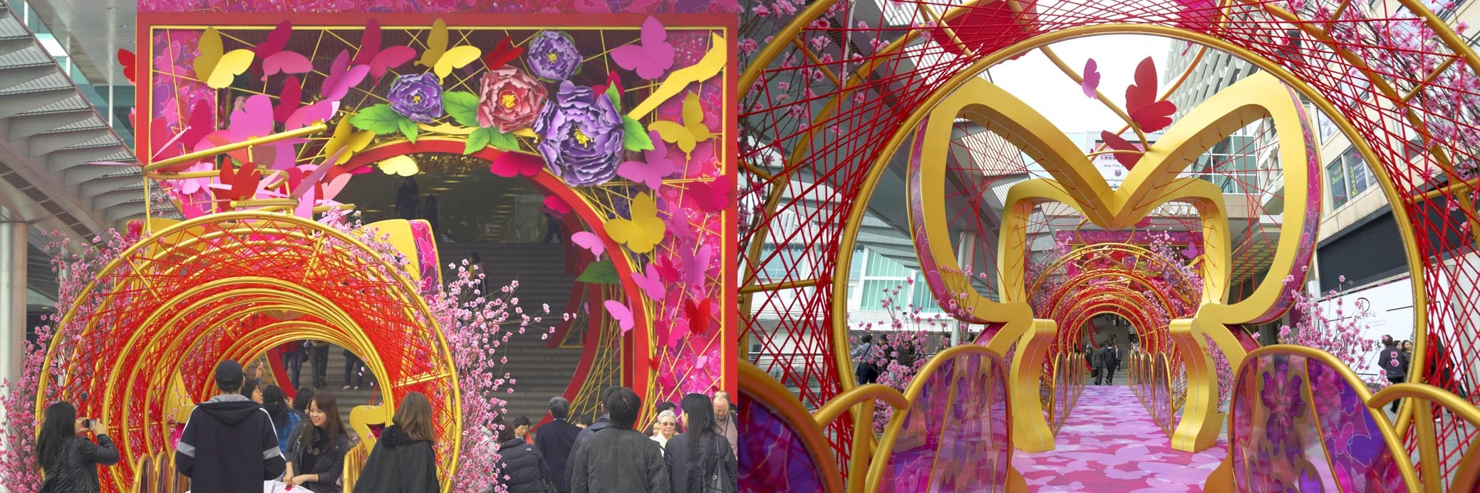海港城海運大廈正門設置以金色及桃紅色為主色,桃紅色的柱身及長廊布滿了三千多只金色喜蝶,在巨型牡丹花叢襯托下翩翩起舞。而正門天花更掛上了3 組由許多只蝴蝶組成的12尺闊巨型喜蝶,俏麗的喜蝶在花叢中欣然起舞,春意盎然般躍現活潑朝氣,寓意“花開富貴”、“喜蝶迎春”,跟大家一起迎接新春佳節。