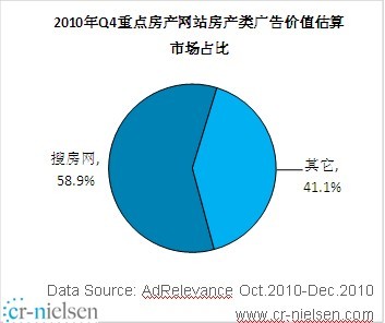 北京2011年1月28日電 /美通社亞洲/ -- 近期,全球權(quán)威機(jī)構(gòu)CR-Nielsen(尼爾森)發(fā)布《2010年第四季度中國房地產(chǎn)網(wǎng)絡(luò)展示廣告市場研究項(xiàng)目報(bào)告》(以下簡稱報(bào)告)顯示,2010四季度年中國房地產(chǎn)網(wǎng)絡(luò)展示廣告市場整體發(fā)展良好,廣告推廣項(xiàng)目、廣告主數(shù)、創(chuàng)意數(shù)環(huán)比第三季度均有穩(wěn)健增長。搜房網(wǎng)在這三個(gè)核心考核指標(biāo)中以近六成的比例高居榜首,其中在房產(chǎn)類廣告主指標(biāo)上優(yōu)勢顯著,行業(yè)占比高達(dá)75.9%。