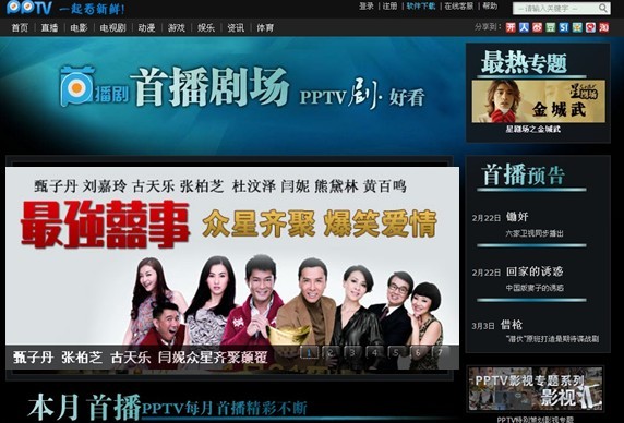 PPTV 網絡電視首播劇場涵蓋了目前市面上熱門的正版影視劇和電影,其中包含了湖南衛視年度穿越大劇《宮》、2011年諜戰巨作《風雨》、經典古裝探索續集《神斷狄仁杰》等。而本次強力上線的港式喜劇《較強喜事》則被網友們譽為集香港喜劇之大成作品,劇中主演古天樂首次嘗試扮演娘娘腔、甄子丹用“詠春拳”化妝、張柏芝產后首部復出作品以及杜汶澤男扮女裝搞笑演繹“忐忑”等看點都獲得網友們極高的關注,同時也成為該劇在 PPTV 網絡電視上收視創新高的佐證。