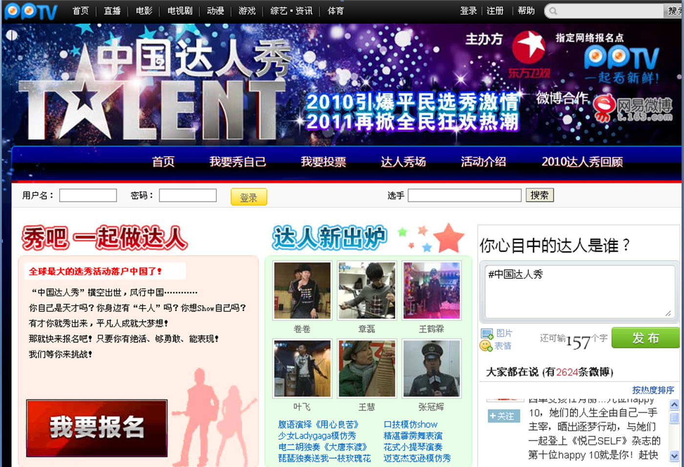 PPTV 網絡電視中國達人秀網絡報名地址:http://drx.pptv.com/2011/