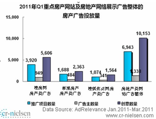北京2011年5月4日電 /美通社亞洲/ -- CR-Nielsen(尼爾森互聯(lián)網(wǎng)研究)《2011年中國房地產(chǎn)網(wǎng)絡(luò)展示廣告市場研究項目報告》顯示,2011年中國房地產(chǎn)網(wǎng)絡(luò)展示廣告市場第一季度與去年同期相比呈增長態(tài)勢。2011年 Q1搜房網(wǎng)房產(chǎn)類網(wǎng)絡(luò)展示廣告投放量同比平穩(wěn)增長。與去年同期相比,2011年 Q1搜房網(wǎng)房產(chǎn)廣告推廣項目數(shù)同比增長91.7%,增長較快。