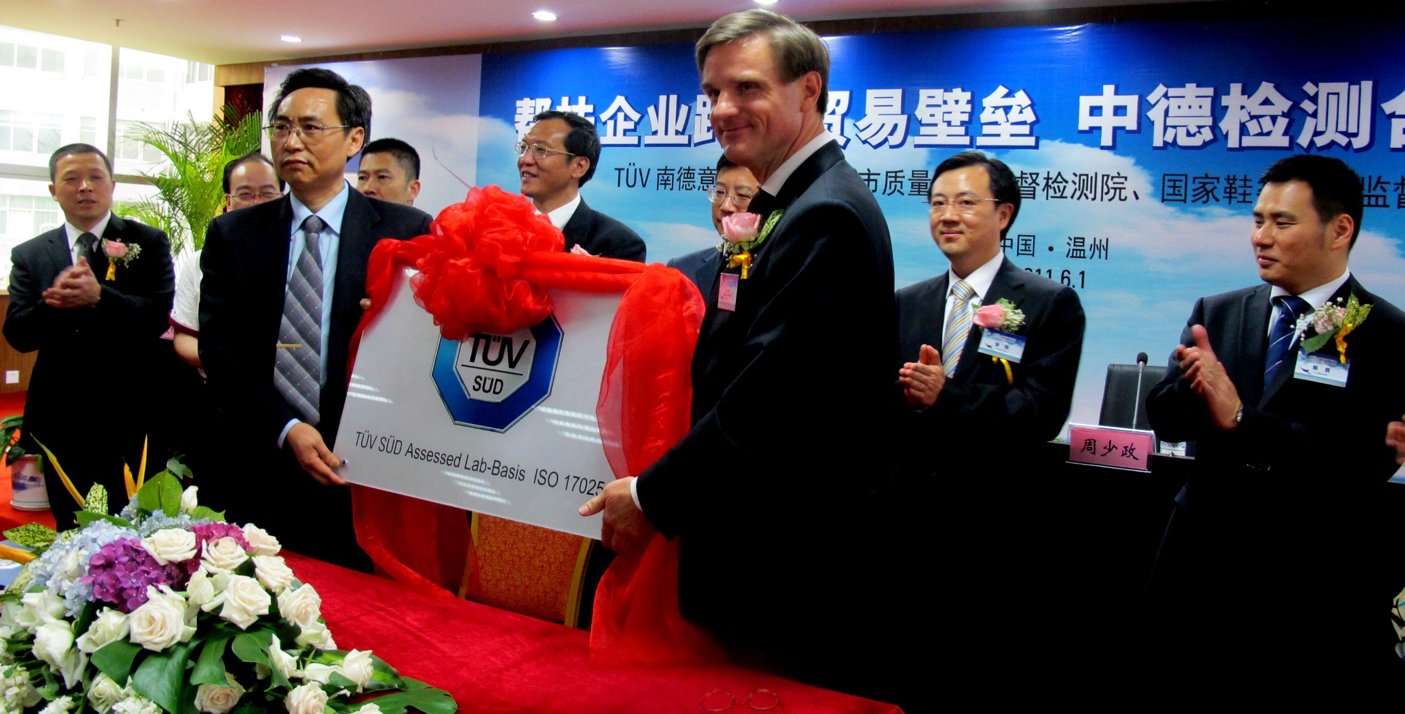溫州2011年6月2日電 /美通社亞洲/ -- 2011年6月1日,溫州市質(zhì)檢院與TUV南德意志集團在中國鞋都國家鞋檢中心大樓舉行了檢測合作簽約儀式。儀式由市質(zhì)監(jiān)局局長吳一新主持。市委常委、副市長周少政,TUV 南德意志大中華集團首席執(zhí)行官&總裁范華德(Dirk von Wahl)出席了簽約儀式。市質(zhì)檢院院長余建明和范華德總裁代表雙方簽署了合作文件,并向合作實驗室授牌。