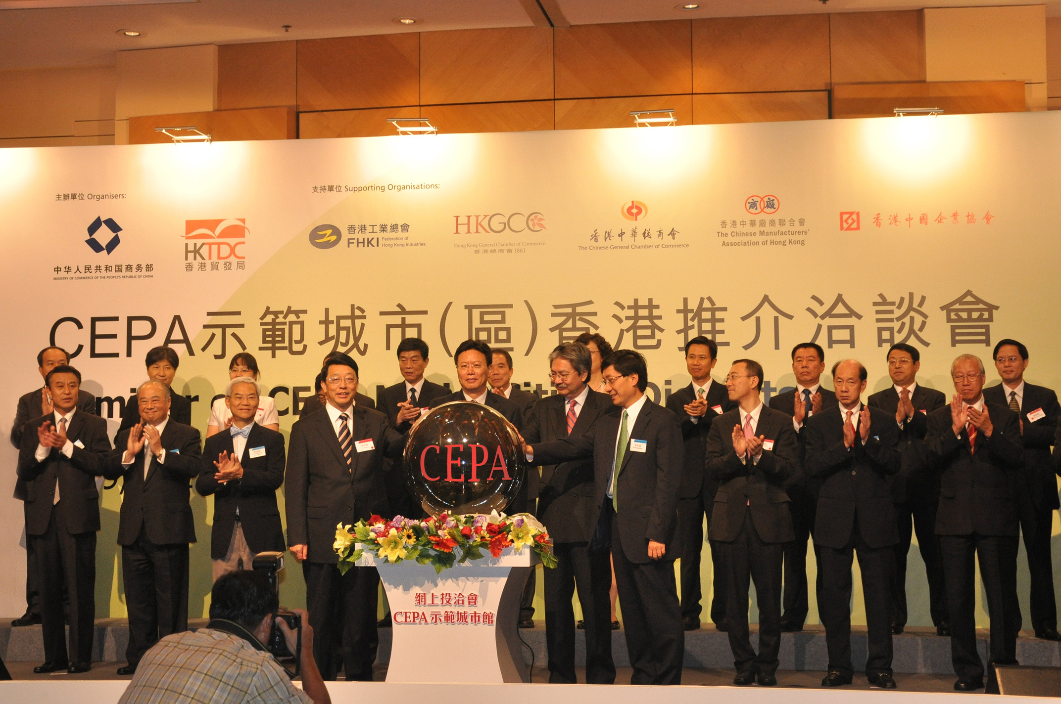 香港2011年9月19日電 /美通社亞洲/ -- 近日,由國家商務部、香港貿易發展局主辦的CEPA 示范城市(區)香港推介洽談會在香港會議展覽中心隆重舉行。商務部部長助理俞建華、香港特區政府財政司司長曾俊華、香港貿發局總裁林天福與重慶市副市長劉學普一起啟動開通網上投洽會“CEPA 示范城市館”。