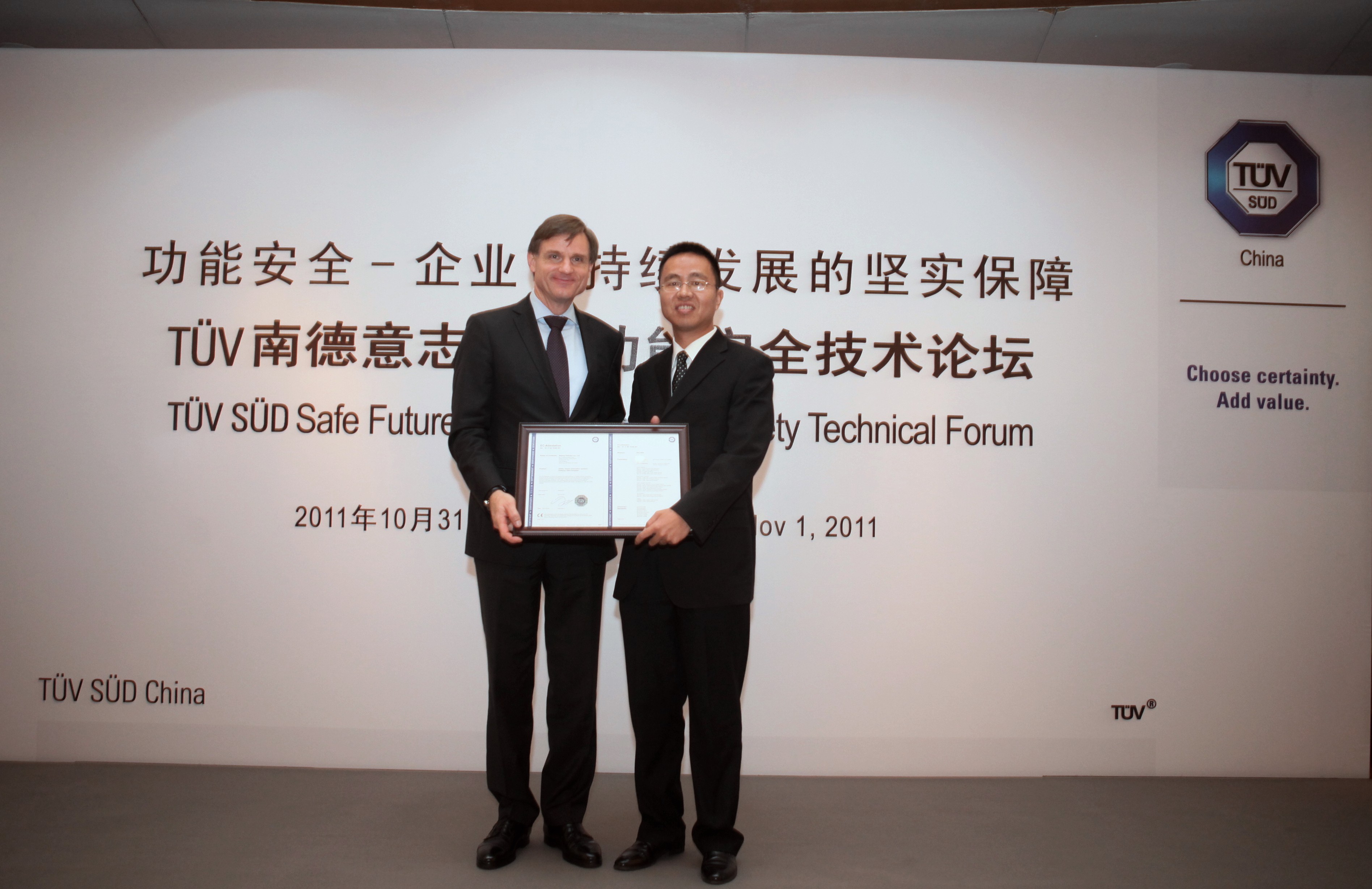 北京2011年11月1日電 /美通社亞洲/ -- 繼北京和利時系統工程有限公司(以下簡稱“和利時”)通過 TUV 南德意志集團(以下簡稱“TUV SUD”)專業的第三方功能安全評估與認證之后,在 TUV SUD “功能安全技術論壇”活動中,TUV SUD 向和利時頒發了 SIL4 等級功能安全認證證書,這是 TUV SUD 在中國頒發的首張 SIL4 等級功能安全認證證書,標志著和利時的產品和技術已經達到了功能安全完整性的較高等級要求,正式拿到進入歐洲及國際軌道市場的通行證。儀式中,TUV SUD 大中華集團總裁 & CEO 范華德(Dirk von Wahl)先生為北京和利時系統工程有限公司軌道交通自動化事業部設計中心常務副總經理李劍先生頒發證書。