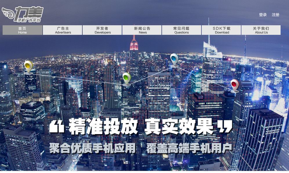 力美移動廣告平臺 -- 力美廣告傳媒自主研發的智能手機廣告平臺,是由國際著名風險投資商 IDG 在中國投資的唯一一家專業移動媒體。平臺瞄準7億手機用戶,致力于為數以萬計的企業廣告主提供精準的移動互聯網產品營銷和品牌推廣服務,為手機應用開發者創造公正和優質的廣告收益。