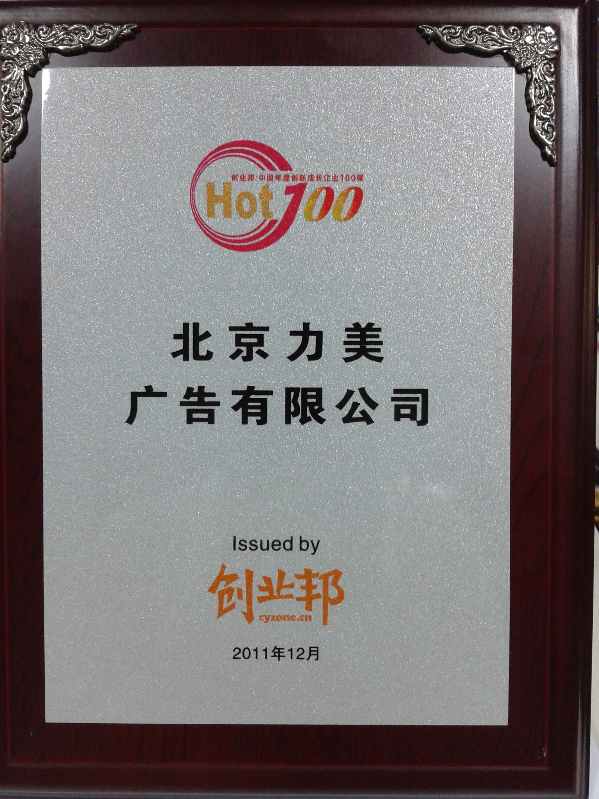 北京2011年12月5日電 /美通社亞洲/ -- 12月2日,“2011創(chuàng)業(yè)邦年會(huì)暨創(chuàng)業(yè)邦100年度頒獎(jiǎng)典禮”上,“創(chuàng)新成長(zhǎng)企業(yè)100強(qiáng)”新鮮出爐,北京力美廣告有限公司榜上有名。