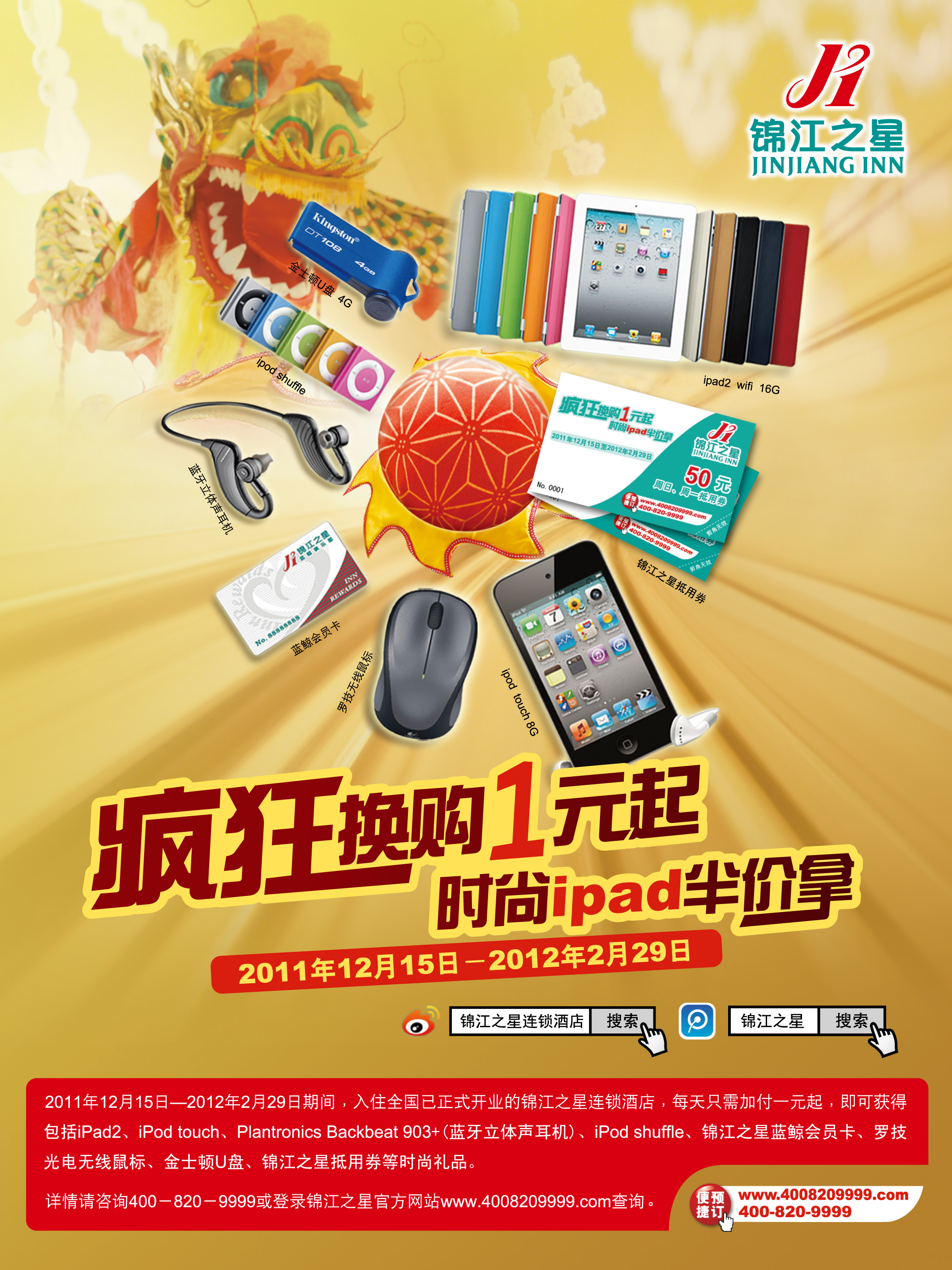 上海2011年12月6日電 /美通社亞洲/ -- 在連續(xù)兩年推出“千萬獎品別錯過”活動引爆春節(jié)市場后,錦江之星將于2012年春節(jié)期間再掀優(yōu)惠風(fēng)暴。從2011年12月15日起,至2012年2月29日,錦江之星將推出“瘋狂換購1元起,時尚iPad半價拿”主題優(yōu)惠活動,錦江之星體驗券、藍鯨會員卡和眾多時尚數(shù)碼獎品,只要1元起,即可超值換購。