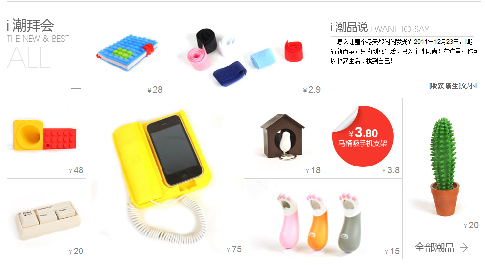 北京2011年12月26日電 /美通社亞洲/ -- 誰說實用的東西一定不好看不好玩?中國領先的個性印品平臺網易印像派熱力推出全新創意雜物頻道 -- “I 潮品”(http://yxp.163.com/iwave/index/)。該頻道網羅全球各地最有意思的“創意潮流雜物”,為用戶打造一個包括生活、學習、搞怪和出行四個維度的趣味、實用、極具設計感的“小東西”購物平臺。“I 潮品”頻道是網易印像派“無設計,不生活”品牌理念的進一步詮釋,豐富了網易印像派消費者的選擇。