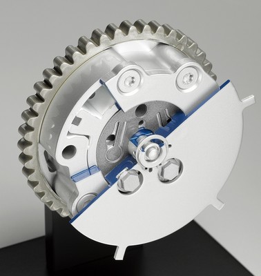 為持續提升動力性、燃油經濟性且降低排放。博格華納在本屆車展首次亮相了可變氣門正時技術,通過調整進氣、排氣的量,和進排氣閥開合時間,角度使進入的空氣量達到較佳,提高燃燒效率。但傳統的該技術損耗了發動機的大量能量,使得發動機轉速扭矩不足。博格華納開發出了一種創新的調整凸輪軸相位方法:利用凸輪軸扭矩交替變化的能量不停開、關液壓閥門來調整凸輪軸相位。通過減少動力損耗,提升功率及幫助實現發動機清潔燃燒來提升燃油經濟性。