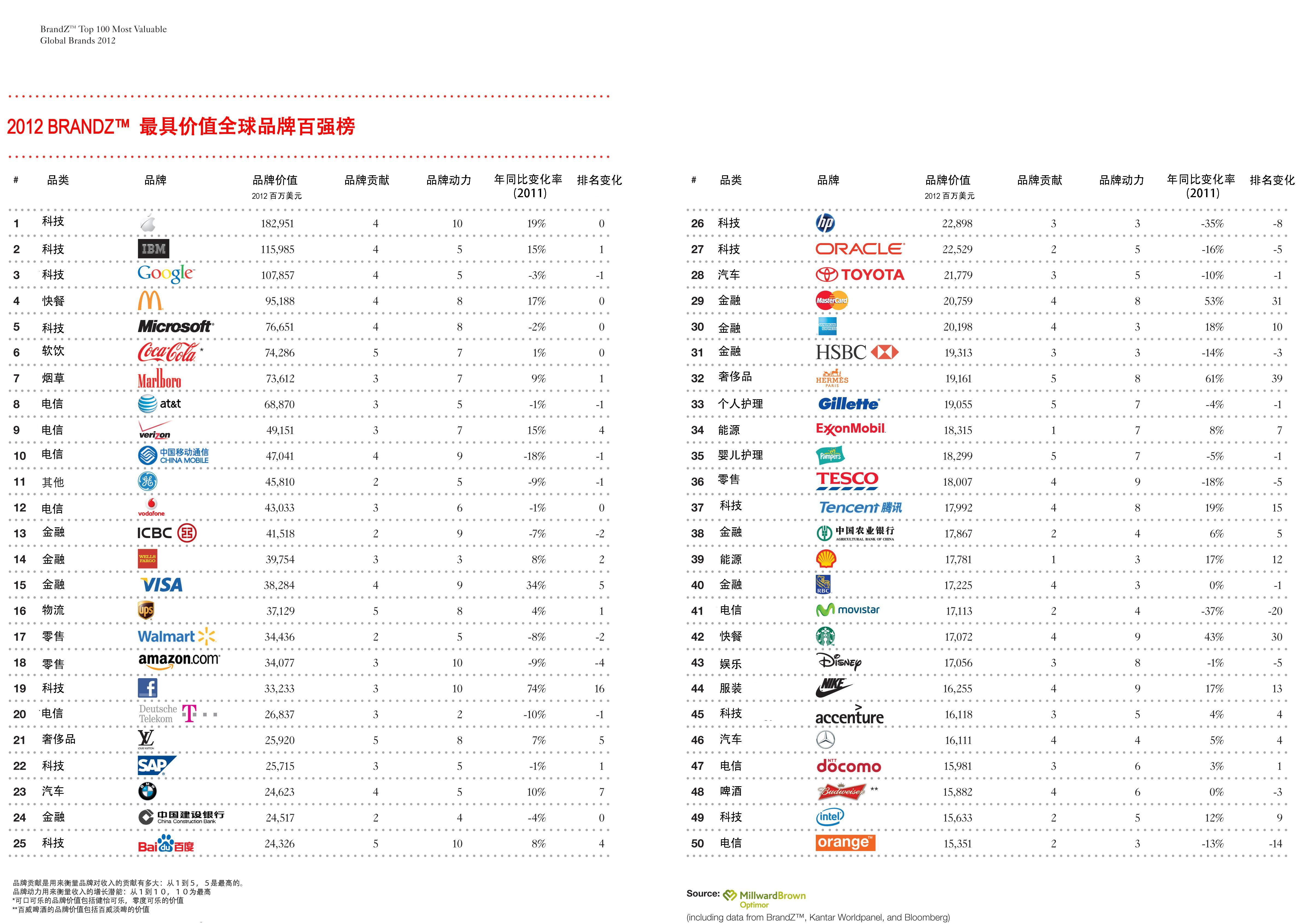 BrandZ 最具價(jià)值全球品牌百強(qiáng)調(diào)查不僅對(duì)財(cái)務(wù)數(shù)據(jù)、市場(chǎng)估價(jià)、分析報(bào)告和風(fēng)險(xiǎn)預(yù)測(cè)進(jìn)行了縝密的分析,而且還考慮了消費(fèi)者的意見,這在全世界可謂絕無僅有。調(diào)查報(bào)告在互聯(lián)網(wǎng)上發(fā)布,內(nèi)容包括全球主要地區(qū)和 13 個(gè)市場(chǎng)領(lǐng)域的最具價(jià)值品牌排名結(jié)果及分析。單擊此處下載完整的 BrandZ 排行榜,其中包括地區(qū)和類別細(xì)分排名。排行榜及其他相關(guān)信息還通過免費(fèi)的蘋果及安卓交互式應(yīng)用程序或iPad 雜志提供。