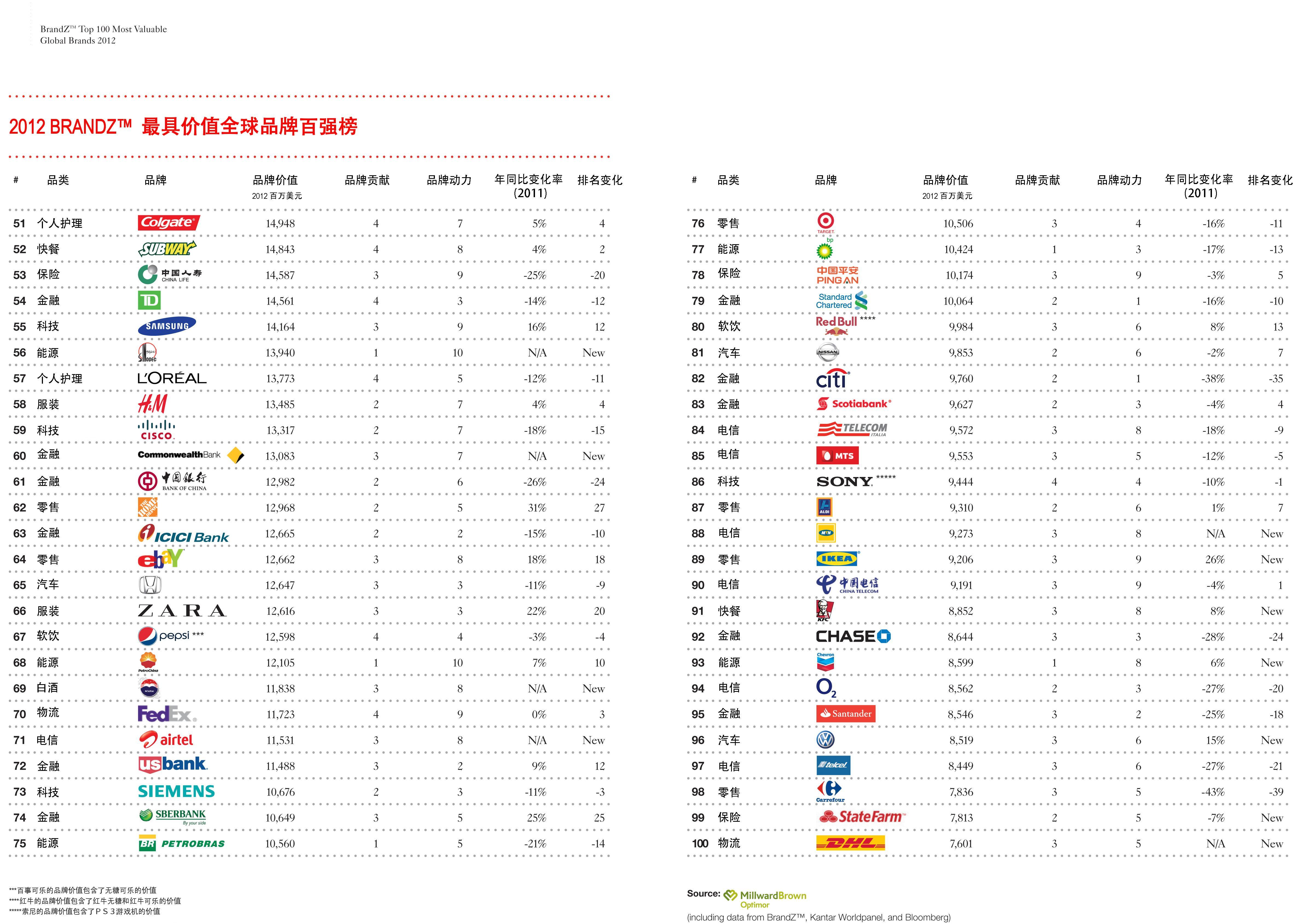 BrandZ 最具價(jià)值全球品牌百強(qiáng)排行榜由 Millward Brown Optimor 針對(duì) WPP 旗下公司開發(fā),現(xiàn)已進(jìn)入第七個(gè)年頭。這項(xiàng)調(diào)查不僅對(duì)各家公司的財(cái)務(wù)和業(yè)務(wù)績(jī)效(使用來自彭博社和 Kantar Worldpanel 公司的數(shù)據(jù))開展縝密分析,并估算出品牌在帶動(dòng)業(yè)務(wù)收入增長(zhǎng)、增加企業(yè)市值方面產(chǎn)生的價(jià)值,還獨(dú)樹一幟地就全球數(shù)千個(gè)“面向消費(fèi)者”和“企業(yè)對(duì)企業(yè)”品牌對(duì)全球 200 多萬消費(fèi)者進(jìn)行采訪,據(jù)以衡量品牌價(jià)值。品牌的消費(fèi)者認(rèn)知度是決定品牌價(jià)值的重要因素,因?yàn)槠放剖菢I(yè)務(wù)績(jī)效、產(chǎn)品交付、定位清晰度和領(lǐng)先優(yōu)勢(shì)的集合體。榜單的排名考慮了地區(qū)差異,因?yàn)榧词故钦嬲娜蚱放疲放曝暙I(xiàn)的衡量方式也可能存在重大的國別差異。