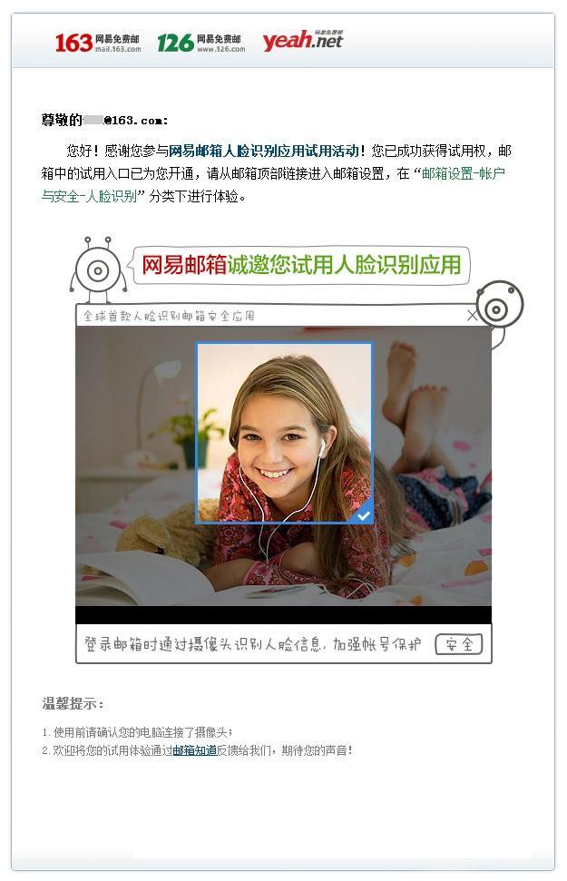 網(wǎng)易郵箱表示,招募活動即日起啟動,持續(xù)一個月,每日約招募200名,共計招募6000名左右用戶來試用,網(wǎng)友可以登錄http://u.163.com/faceauth或在網(wǎng)易免費(fèi)郵箱的官方微博上申請試用,網(wǎng)易郵箱的鉆石用戶、黃金用戶和手機(jī)號碼郵箱用戶申請可優(yōu)先獲得試用權(quán)。網(wǎng)易郵箱將為獲得試用權(quán)的用戶開通郵箱內(nèi)的試用,用戶可以從郵箱頁面頂部鏈接進(jìn)入郵箱設(shè)置,在“郵箱設(shè)置-賬戶與安全-人臉識別”分類下進(jìn)行體驗(yàn),“相信對科技或新事物有興趣的用戶會躍躍欲試,”網(wǎng)易郵箱相關(guān)負(fù)責(zé)人說。