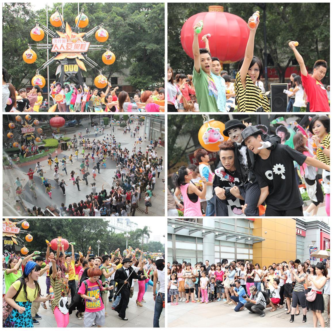 6月2日中午時分,也就是12點整,在摩天輪前上演了一場極富戲劇性的快閃秀。快閃現場架設了5個攝影機位,35個舞者在路人毫不知情、毫無準備的情況下,一哄而出,集體跳起撼動現場的舞步。當陳奕迅特意為『美汁源』創作的主題曲《人人愛》響徹萬達廣場時,這群充滿活力的年輕人用舞蹈完美地詮釋了“人人愛果粒”的主題,將『美汁源』陽光、活潑、快樂的品牌特質發揮得淋漓盡致,舞動期間,還為圍觀的行人空拋美汁源果汁,送上了爽口美味的『美汁源』果汁飲料。