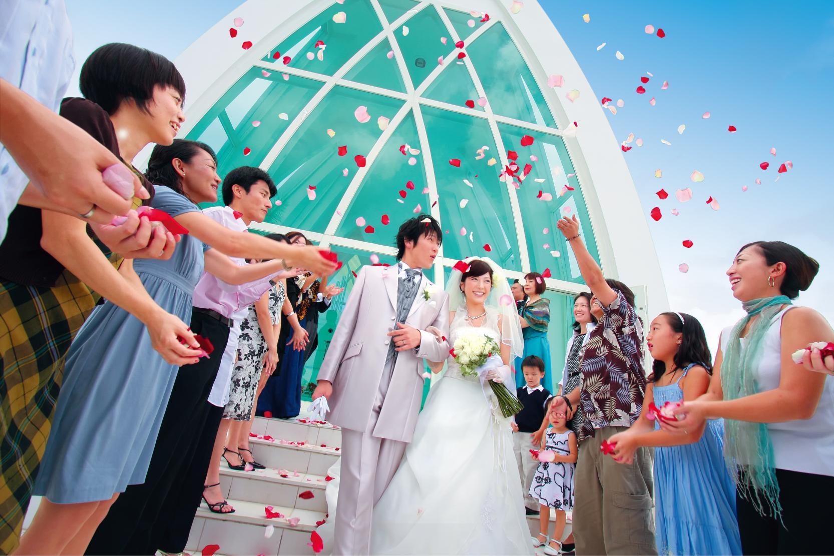 “海戀婚禮堂”興建在藍色的水池上,設計獨特、印象鮮明。藍色和白色的設計跟關島的藍天白云十分配合,象征幸福的彩虹玻璃,玻璃窗一直伸展至教堂的屋頂,空間感和現代感十足,光線亦可自然地由玻璃窗透入室內,窗外更可直視美麗的關島海洋。