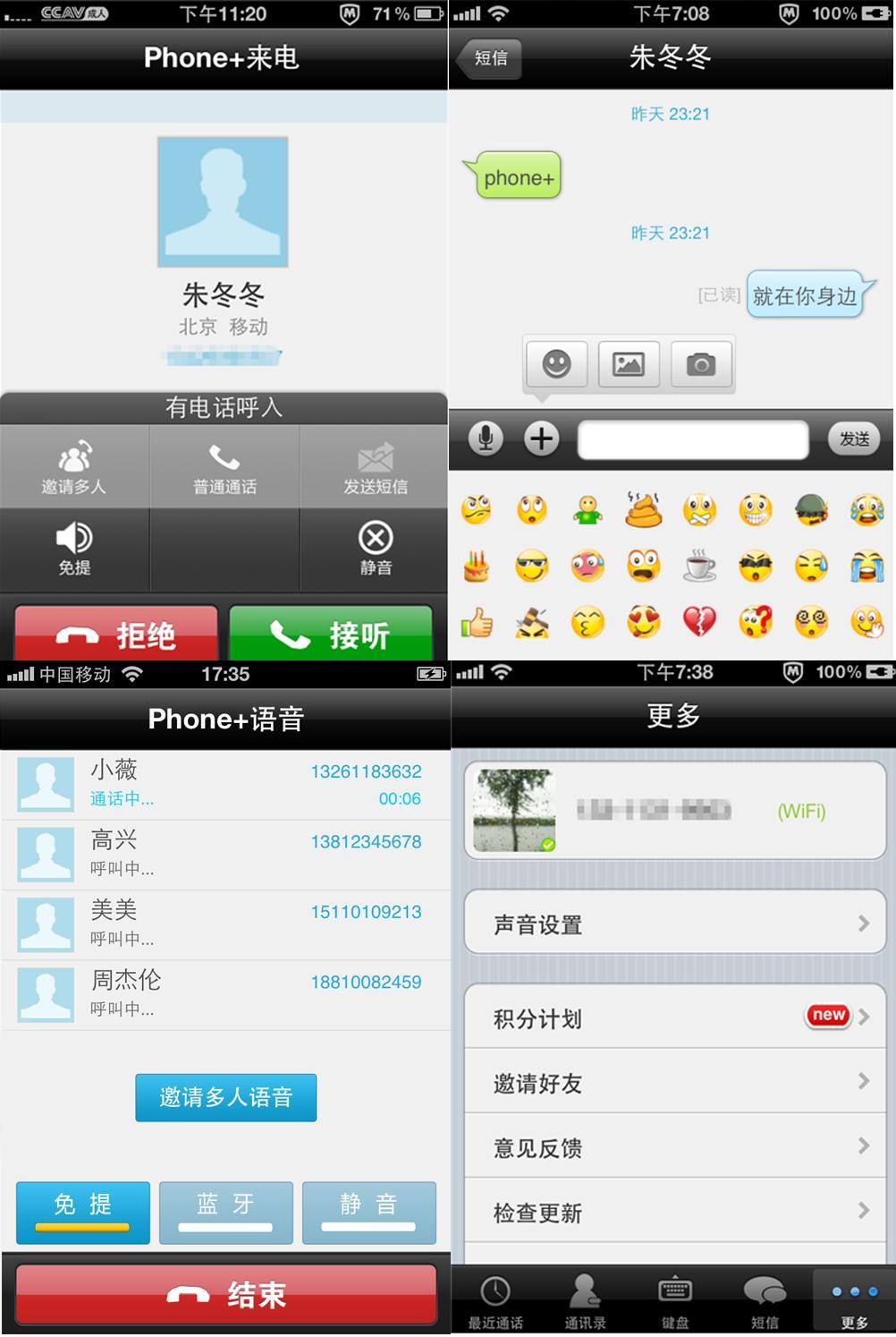 撥號鍵盤與系統自帶界面基本保持一致,撥號時phone+會進行智能定位,且可操作性更好,隱藏通話記錄功能相當實用,讓語音旅程無跡可尋。當phone+聯系人來電時有豐富的選擇,去電時,無法接通的情況給予友好提醒;短信界面清爽簡潔,在系統自帶文字發送功能基礎上新增語音對講/表情發送/拍照發送/照片視頻傳輸等實用功能,使原本枯燥的短信變得立體生動形象起來。