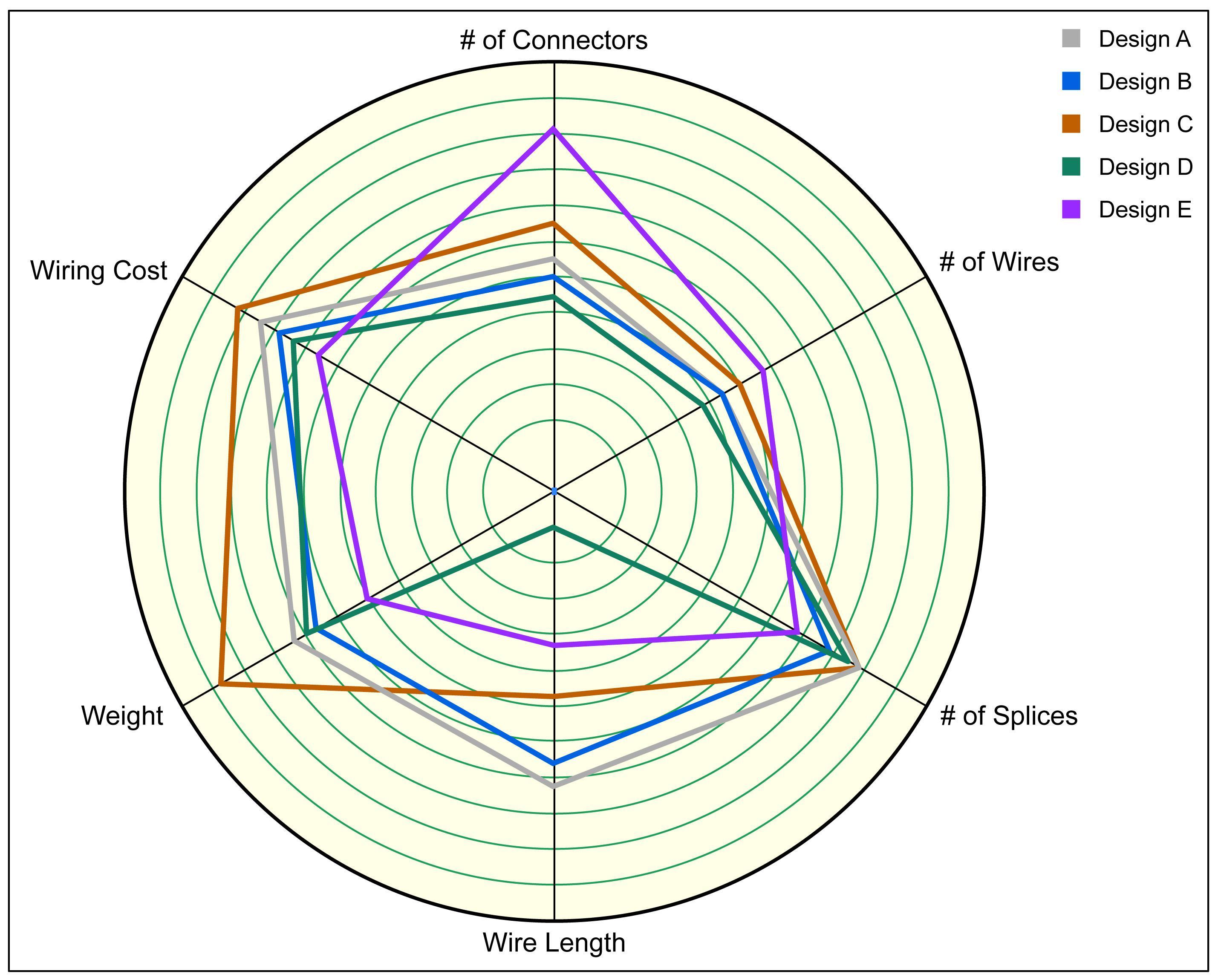 由電氣計算機輔助設計應用程序生成的“蜘蛛網”優化圖對多種線束設計方案的關鍵變量進行比較
