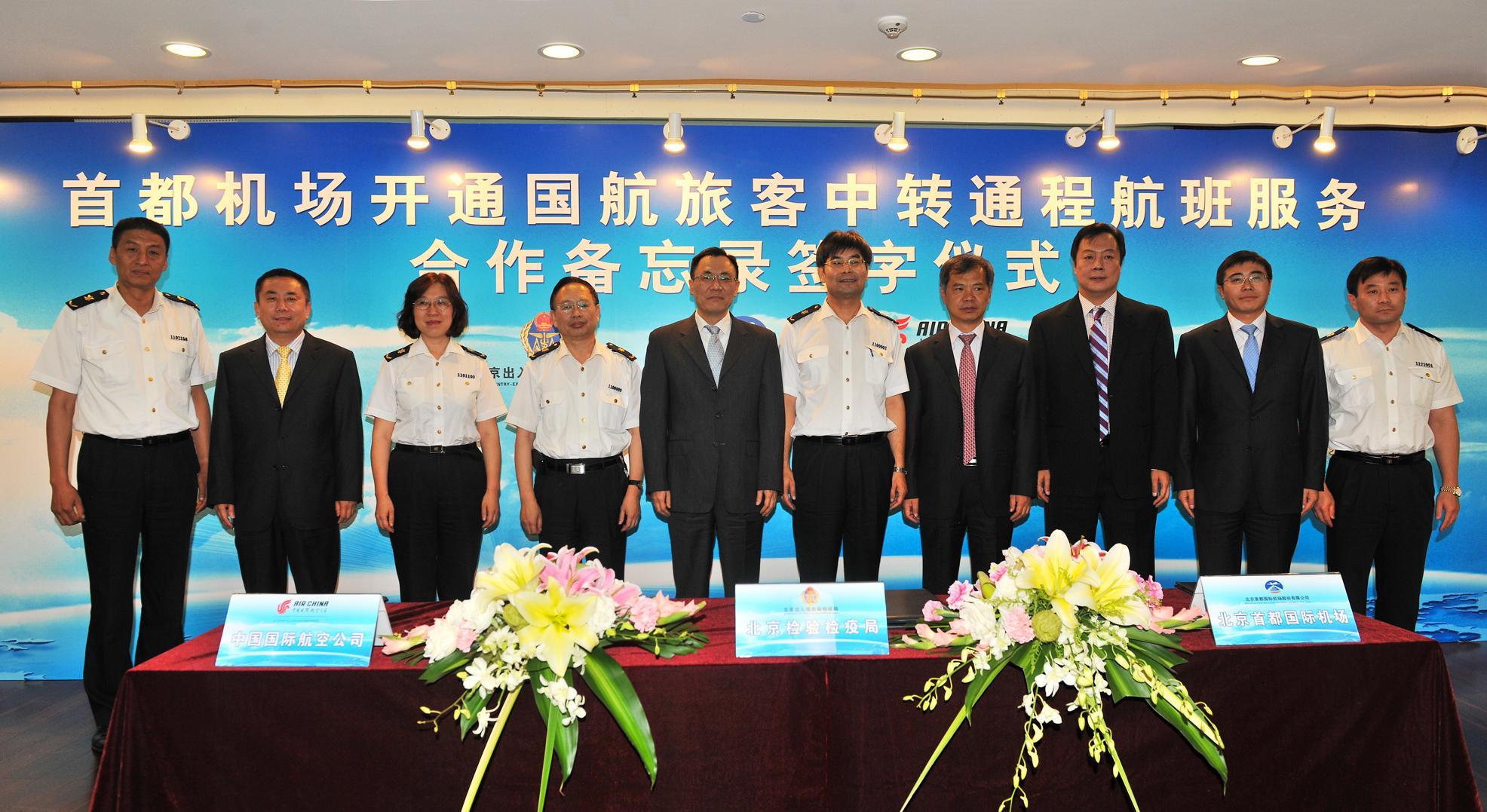 北京2012年9月14日電 /美通社/ -- 9月15日,中國國際航空股份有限公司(以下簡稱“國航”)從德國法蘭克福、意大利米蘭、瑞典斯德哥爾摩三個城市經北京首都國際機場中轉行李直掛服務開始試運行,將大大方便中外旅客。9月14日,北京出入境檢驗檢疫局、北京首都國際機場股份有限公司、中國國航就開通這項服務共同簽署了合作協議,這也是檢驗檢疫等監管部門為方便旅客積極探索、創新合作模式取得的重大突破。北京首都國際機場股份有限公司總經理張光輝、北京出入境檢驗檢疫局副局長楊杰、中國國際航空股份有限公司總裁蔡劍江出席了此次簽約儀式。