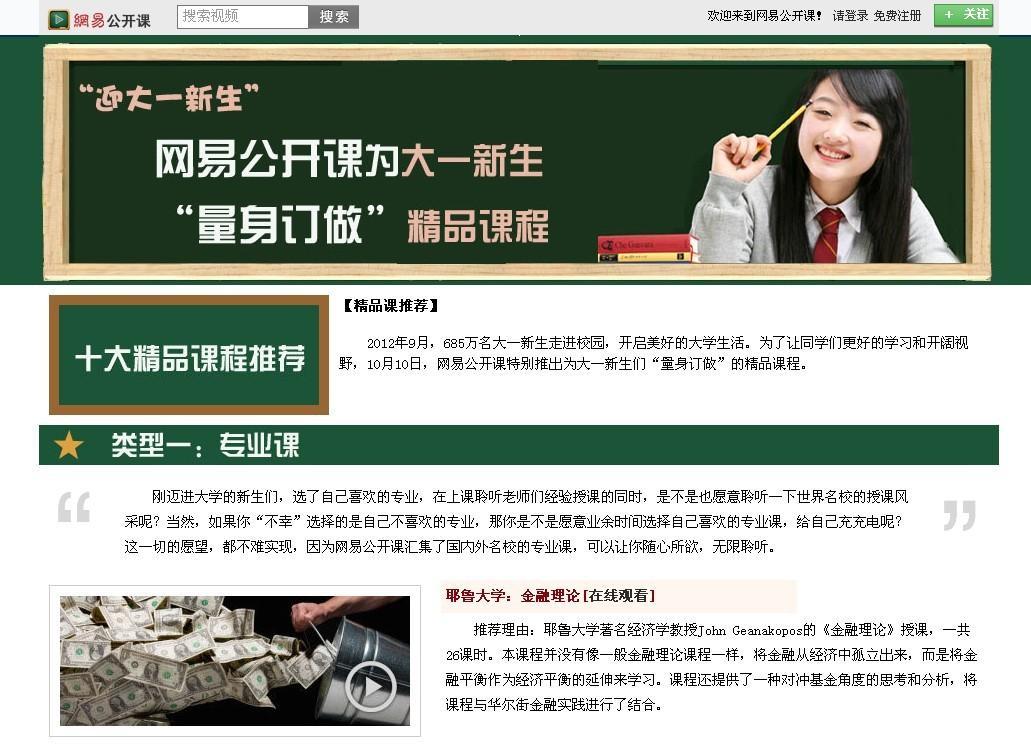10月11日,網(wǎng)易公開課針對大一新生,特別推出了以上“量身訂做”的精品課程。該課程涵蓋專業(yè)課、基礎(chǔ)課、公共課、興趣課四大部分,多方面的給大一新生提供學習和生活支持。網(wǎng)易公開課相關(guān)負責人表示:“網(wǎng)易公開課現(xiàn)有幾十所國際國內(nèi)大學的課程、TED演講以及可汗學院,以后還會增加更多優(yōu)秀課程,努力打造成網(wǎng)上綜合大學。”