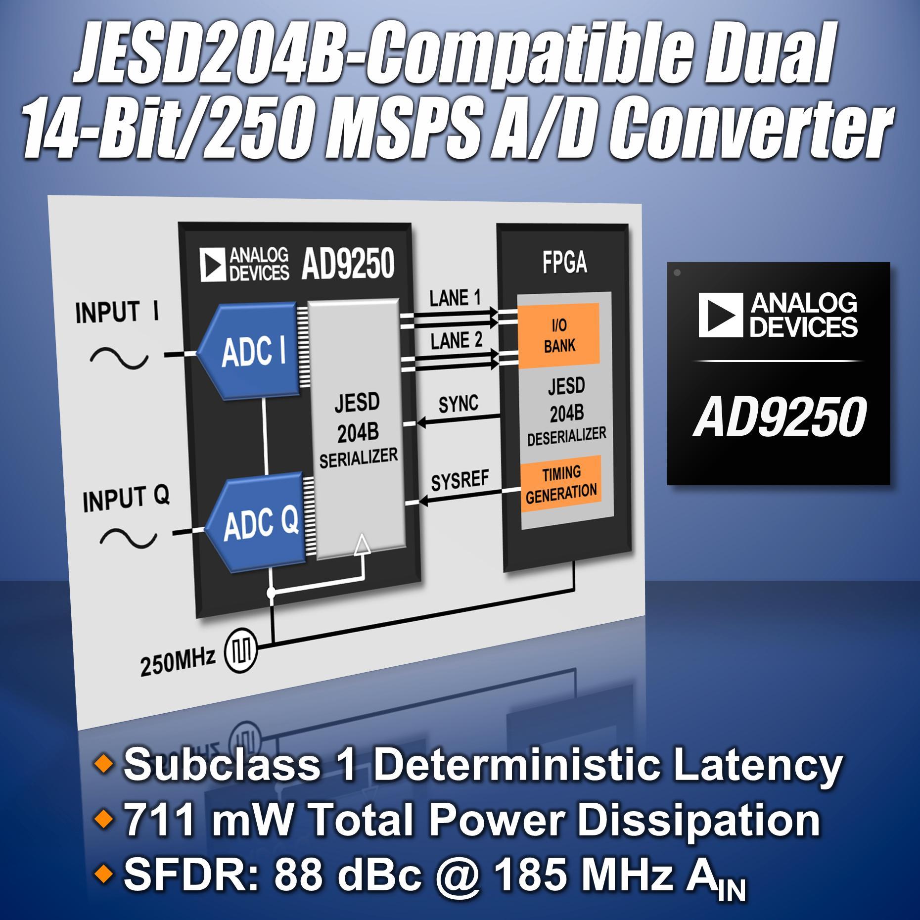 為解決這一需求,Analog Devices, Inc. (ADI: NASDAQ),全球領(lǐng)先的高性能信號處理解決方案供應(yīng)商和數(shù)據(jù)轉(zhuǎn)換技術(shù)領(lǐng)導(dǎo)者*,最近推出采用 JEDEC JESD204B 串行輸出數(shù)據(jù)接口標(biāo)準(zhǔn)的雙通道14位250 MSPS 模數(shù)轉(zhuǎn)換器 AD9250。AD9250 ADC 是市場上首款完全達(dá)到 JESD204B Subclass 1確定性延遲要求的250 MSPS ADC,此功能通過一個串行接口支持多個數(shù)據(jù)轉(zhuǎn)換通道精密同步。