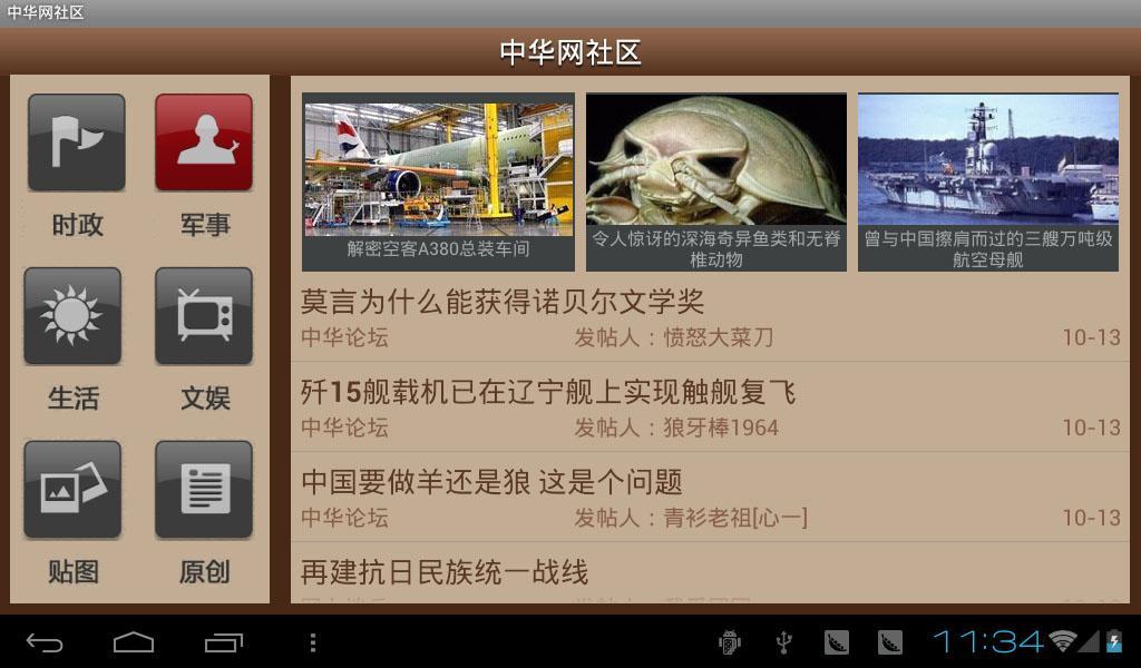 中華網社區電視客戶端(android 版)產品 http://u.china.com/android/club_tv/ 匯聚中華網精華版社區欄目的豐富資源,交互簡潔明了,內容圖文并茂,欄目分為:軍事、時政、生活、文娛、貼圖、原創,6大版塊,覆蓋了中華網社區 WEB 的精品資源,數據與官網時時同步,使電視用戶能夠同步參與到 WEB 社區的討論中來。