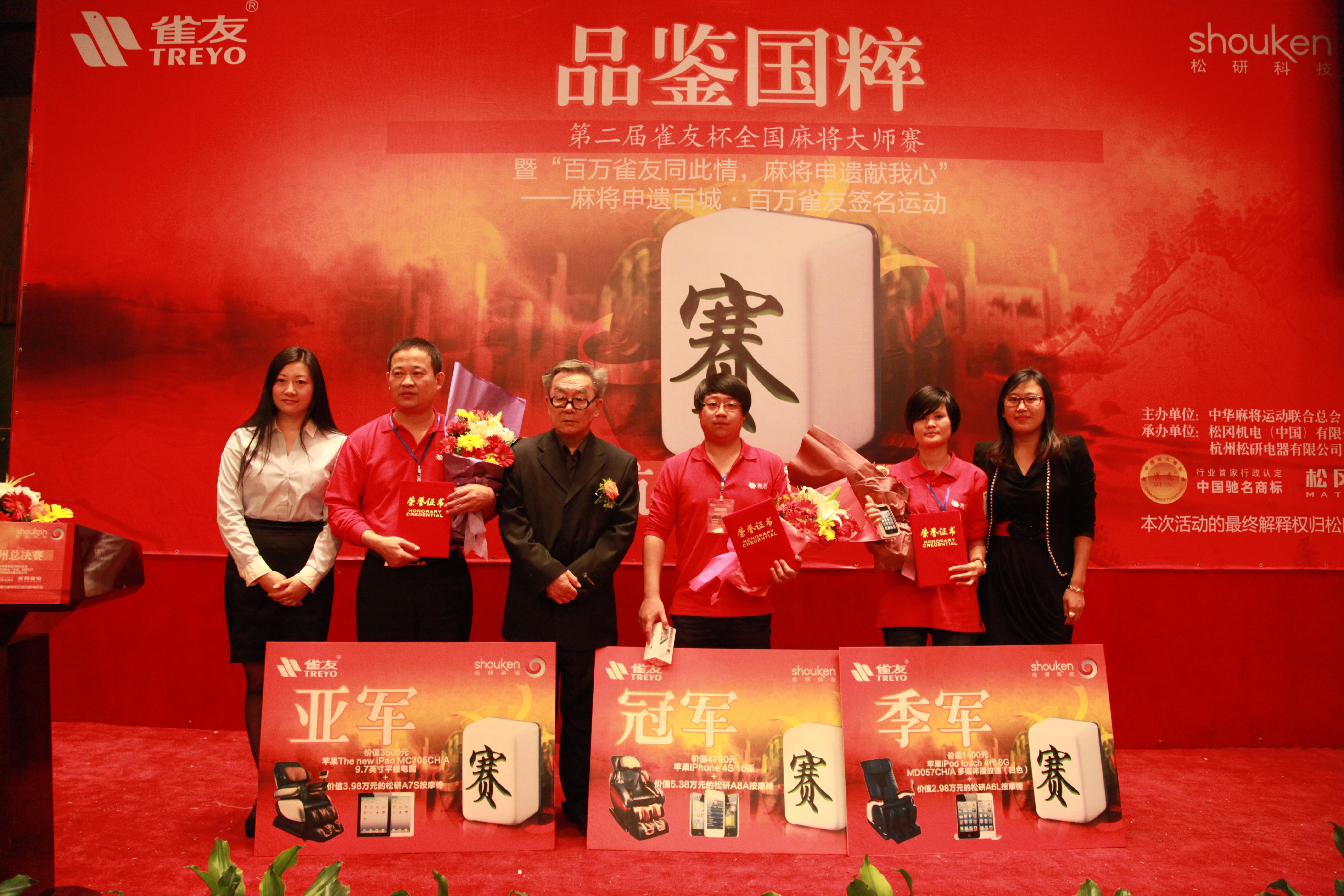 杭州2012年10月29日電 /美通社/ -- 10月27日,品鑒國粹第二屆雀友杯全國麻將大師賽總決賽在杭州眾安假日酒店圓滿落幕。中華麻將運動聯合總會會長盛琦,松岡機電(中國)有限公司董事長魏國華、常務副總經理鄭忠良、營銷中心副總經理何亦男、營運中心副總經理潘林、營運中心總監傅亦明以及杭州松研電器有限公司大客戶總監于雪梅等攜42位來自全國21個分賽區的冠亞軍麻將大師出席大賽。本屆賽事仍由中華麻將運動聯合總會主辦,由目前全球較大的自動麻將機生產基地之 -- 松岡機電(中國)有限公司承辦,并獲得按摩椅產業領先者杭州松研電器有限公司的全程贊助。