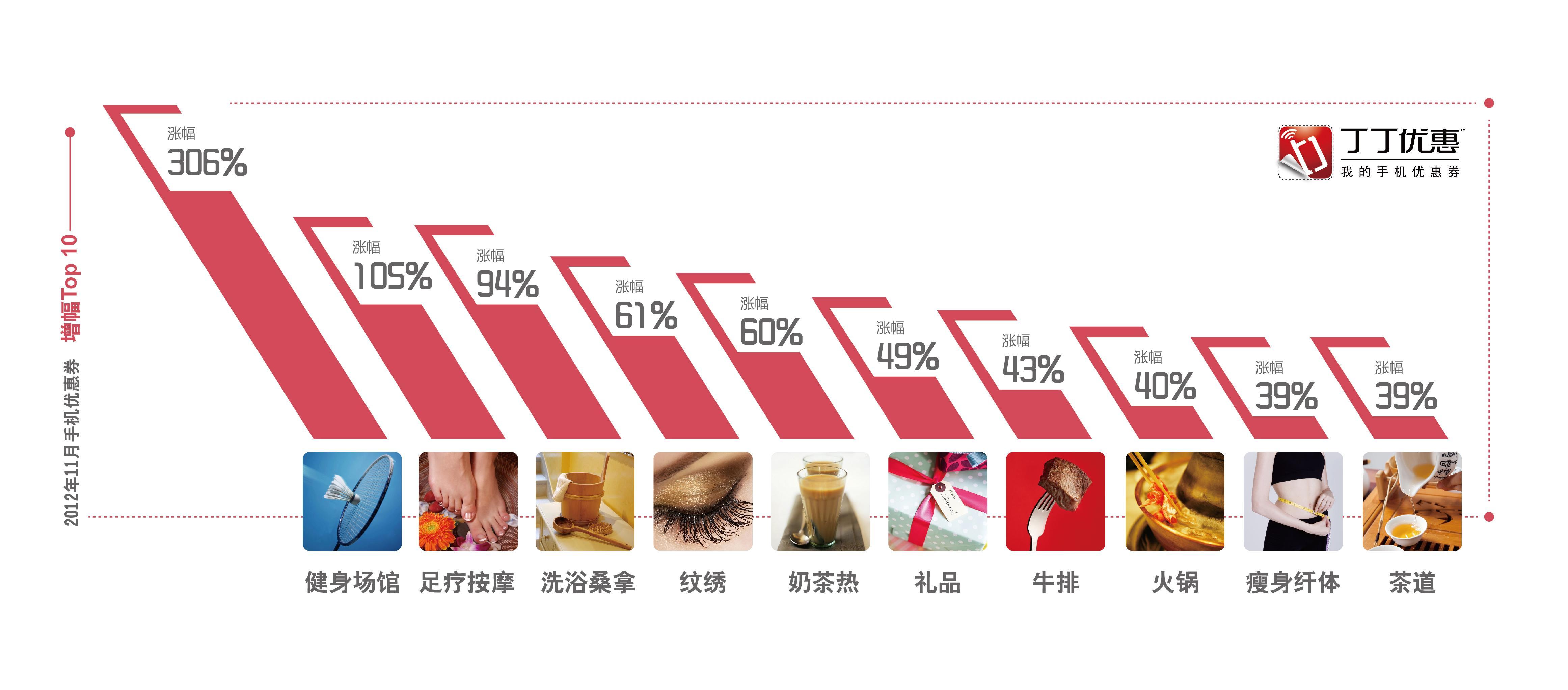 上海2012年12月13日電 /美通社/ -- 今日,國內(nèi)較大的手機(jī)優(yōu)惠券 APP -- 丁丁優(yōu)惠發(fā)布2012年11月份手機(jī)優(yōu)惠券指數(shù)。數(shù)據(jù)顯示,進(jìn)入冬季,天氣因素在很大程度上決定了人們的消費行為,加之11月份鮮有大節(jié)日,用戶的消費趨勢更顯時令性,取“暖”消費是本季生活類消費大趨勢。其中室內(nèi)健身場館搜索量高增306%成為亮點。