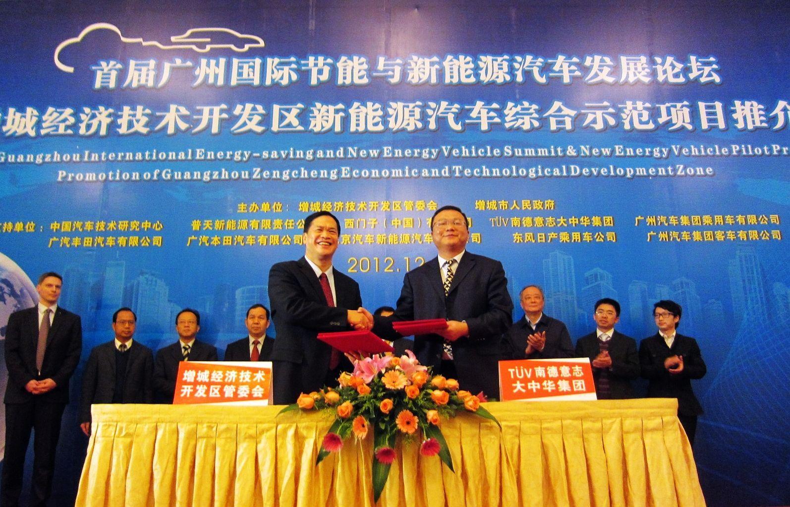 廣州2012年12月19日電 /美通社/ -- 近期,TUV 南德意志集團(以下簡稱TUV SUD)與增城經濟技術開發區在廣州鳳凰城酒店就雙方未來在增城開發區及城區內新能源汽車的測試認證服務發展達成戰略合作協議。此次合作協議的成功簽署,有利于進一步擴大雙方合作的領域,TUV SUD將致力為增城開發區搭建新能源汽車測試認證綜合服務平臺,為相關的新能源汽車采購和檢驗提供一站式服務,并為區內廣汽本田、北汽等汽車生產商與配套商提供便捷一步到位的服務,以加快拓展市場的速度。