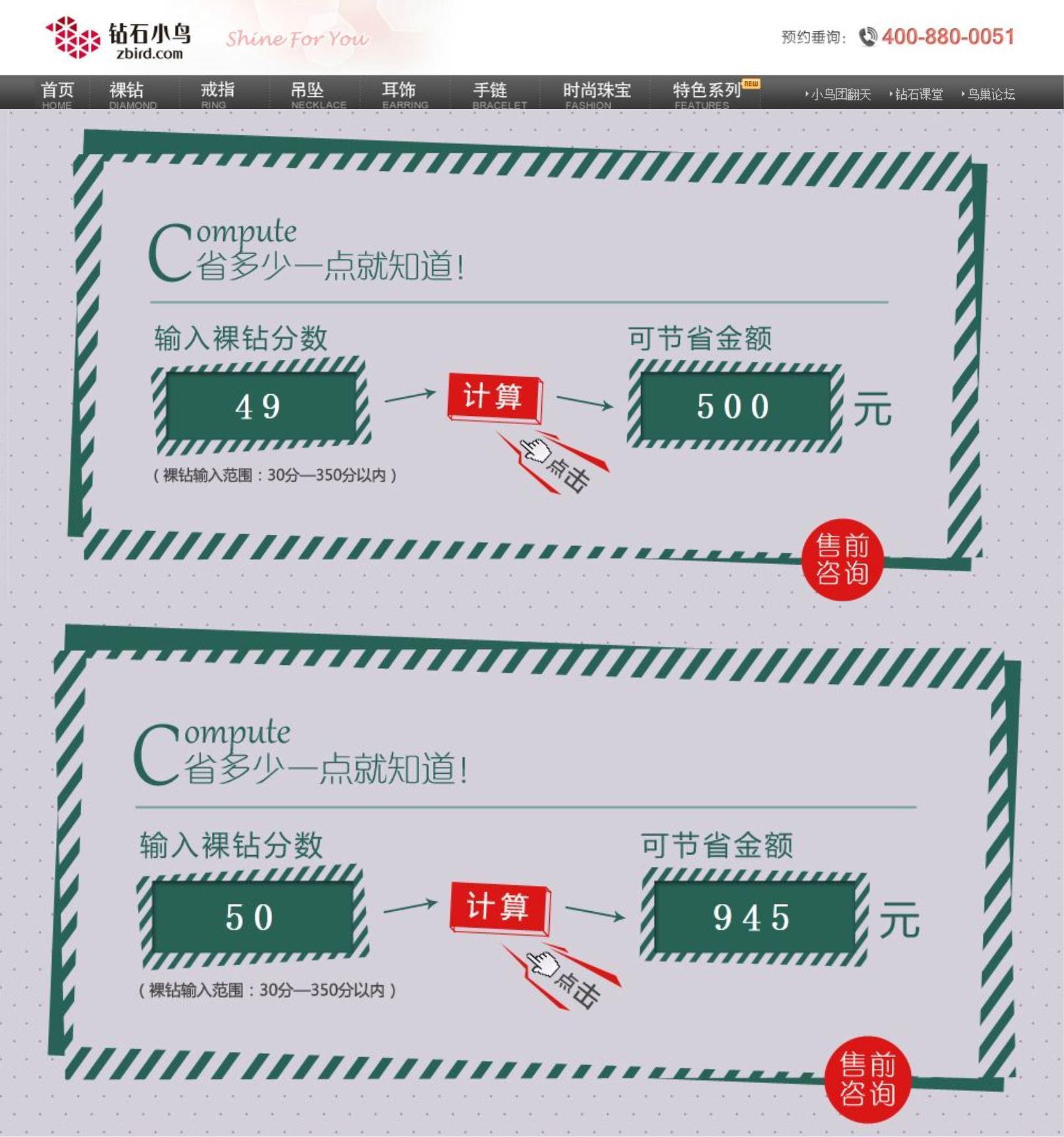 王小姐說:“本來因為結婚的預算有限,只打算買30多分的裸鉆,對比后發現,鉆石小鳥的價格比商場專柜要省40%左右,于是就買了50分的,剛好最近看到五一促銷的這個活動的訊息,我特地算過,49分與50分鉆石相比的話,49分可省500元,而50分卻能省945元。”