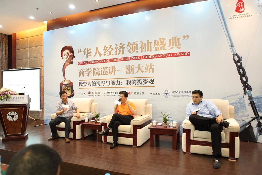 緊接著,主辦方領導鳳凰網副總裁兼總編輯劉書在致辭中表示:自2009年,鳳凰網以‘中華情懷,全球視野,兼容開放,進步力量’理念,攜手《21世紀經濟報道》、中央人民廣播電臺經濟之聲在全球華人范圍內評選10位影響中國乃至世界發展的年度經濟領袖人物,至今已經是第五個年頭了。帶著媒體的使命,及組委會的責任,我們舉辦了一系列的商學院巡講活動,邀請商界領袖與青年精英現場交流,互動觀點。今天商學院巡講是第一次走入浙江,走進浙大,此次商學院巡講走入浙大管理學院,能夠為商界領袖與名校學子搭建交流平臺,互動觀點,是一件非常有意義的事。