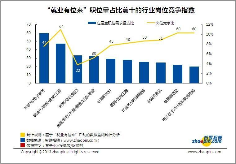 智聯招聘對“就業有位來”發布的崗位從城市分布、行業分布等角度進行了數據分析。結果顯示,互聯網/電子商務行業崗位需求量猛勁,居46大行業之首。該行業職位量占全部行業職位的10%,居首位。但崗位競爭指數并不樂觀,居中等偏下的位置。深入分析互聯網/電子商務行業,發現民營企業的職位量占比高達61%。智聯招聘《2013大學生就業形勢報告》指出,受規模、知名度等影響,應屆生對于“皇糧”的熱衷程度依舊居高不下。而民營企業的急速擴張導致對人才的需求量也在不斷上漲。但落花有意流水無情,求職者對于民營企業的崗位并不熱衷。這也是導致互聯網行業人才難求的原因之一。