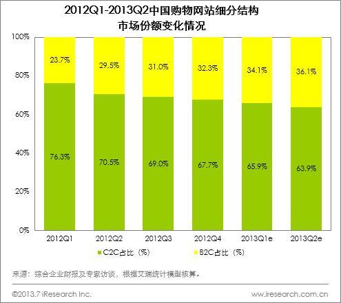 市場(chǎng)結(jié)構(gòu):2013Q2 B2C占網(wǎng)絡(luò)購物市場(chǎng)的36.1%,較2013Q1提高2個(gè)百分點(diǎn)