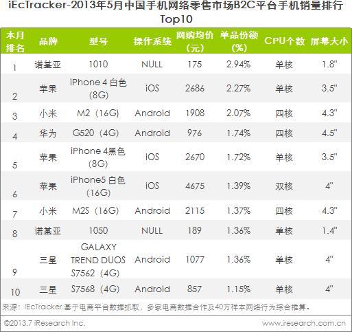 2013年5月中國手機(jī)網(wǎng)絡(luò)零售市場(chǎng)B2C平臺(tái)手機(jī)銷量排行TOP10
