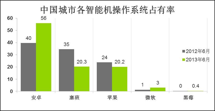 過去的12個月里,各個智能機操作系統的市場占有率發生了巨大變化。譬如,安卓至2013年6月底在中國主要城市占有智能機市場56%的份額,同比增長幅度達到了41%。與此對應的塞班系統卻是過去12個月中較大的輸家,丟失了14.3個百分點至20.3%,也就意味著若塞班繼續其下探速度,市場中50%的現有塞班用戶會在接下去的12個月離開購買其他新手機,蘋果則可能近期取代塞班成為中國第二大智能機操作系統。對于各手機品牌來說,接下去很大一部分的商機則是如何贏取剩余的塞班用戶,而手機價格將是取決于這些消費者走向的重要因素之一。