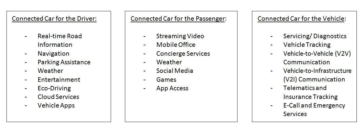 永久性聯網汽車提供的功能幾乎是無限的。聯網汽車的功能可分為三大類:針對駕車者、乘客和車輛本身的服務(圖1)。