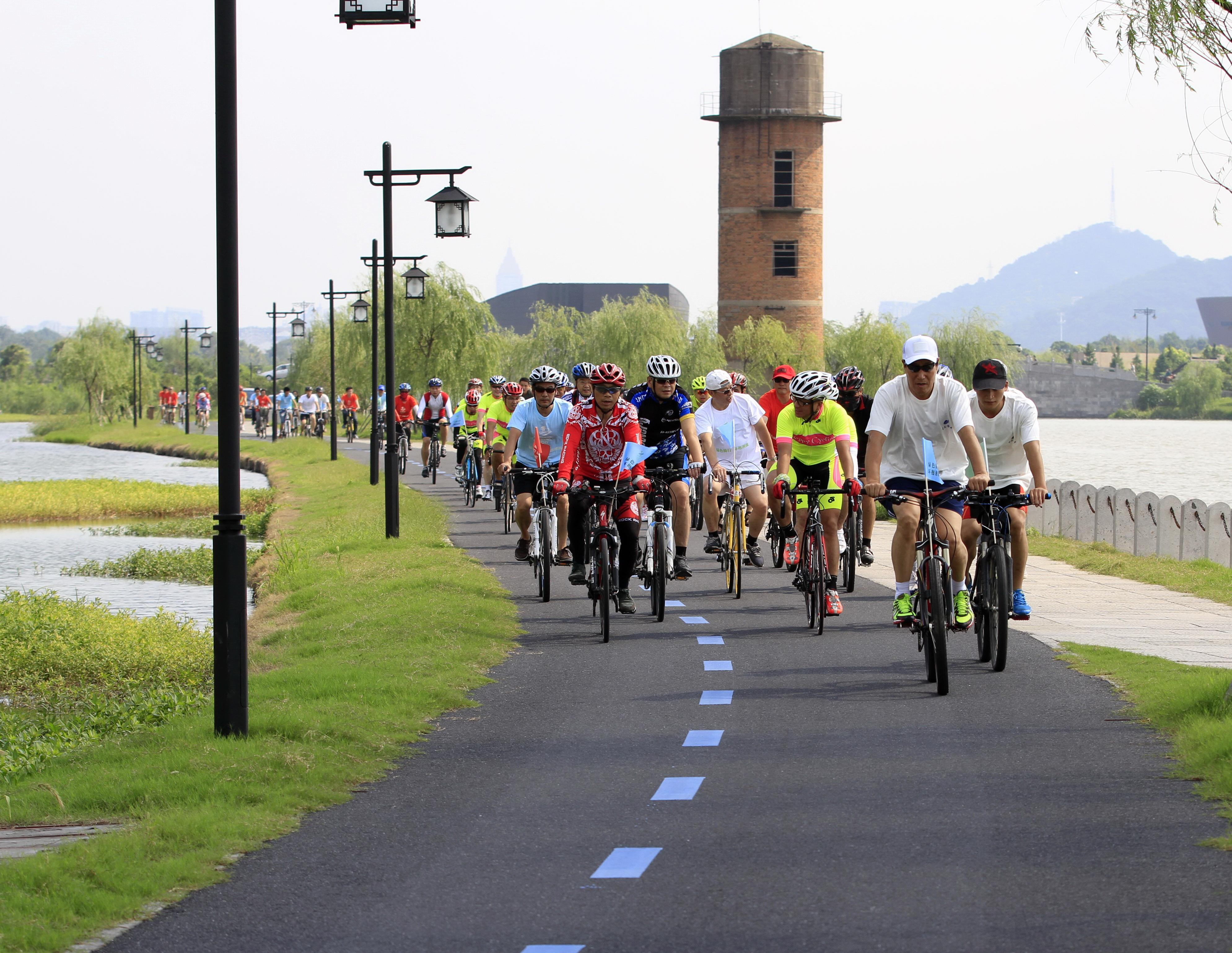 騎行隊伍經金城路、風情大道、湘湖路,到楊堤,過道南橋,進入環湖自行車道,到老虎洞旅游集散中心。沿途引來了眾多市民駐足觀望,也有隊員中途停下來拍照。隊員王先生說,去年一次偶然的機會,看到網友拍的開元自行車騎行活動的照片,也想來體驗下,前幾天正好看到報紙上征集騎友,他就報名參加了。他表示用這種方式踐行了綠色生活,感覺很充實。來自蕭山賓館的小杜說,他們酒店多數員工都選擇了租賃公共自行車加入騎行隊伍,這樣更加綠色環保。她還在騎行途中停下來發微博:平日工作忙碌、壓力大的朋友們,不妨來參加騎行活動,體驗一下“兩岸好山青嶂列,一泓新水綠羅鋪”的湘湖旅游度假區吧,這里有清新的空氣、黛色的群山,浩渺的碧水……結果,不到十分鐘就引來七十余個轉載評價。去年參加過開元騎行日活動的小楊今年又來了,他笑稱,騎上癮了!自從去年參加騎行活動后,這一年來他都騎車上下班,風雨無阻,從中得到了很多快樂!