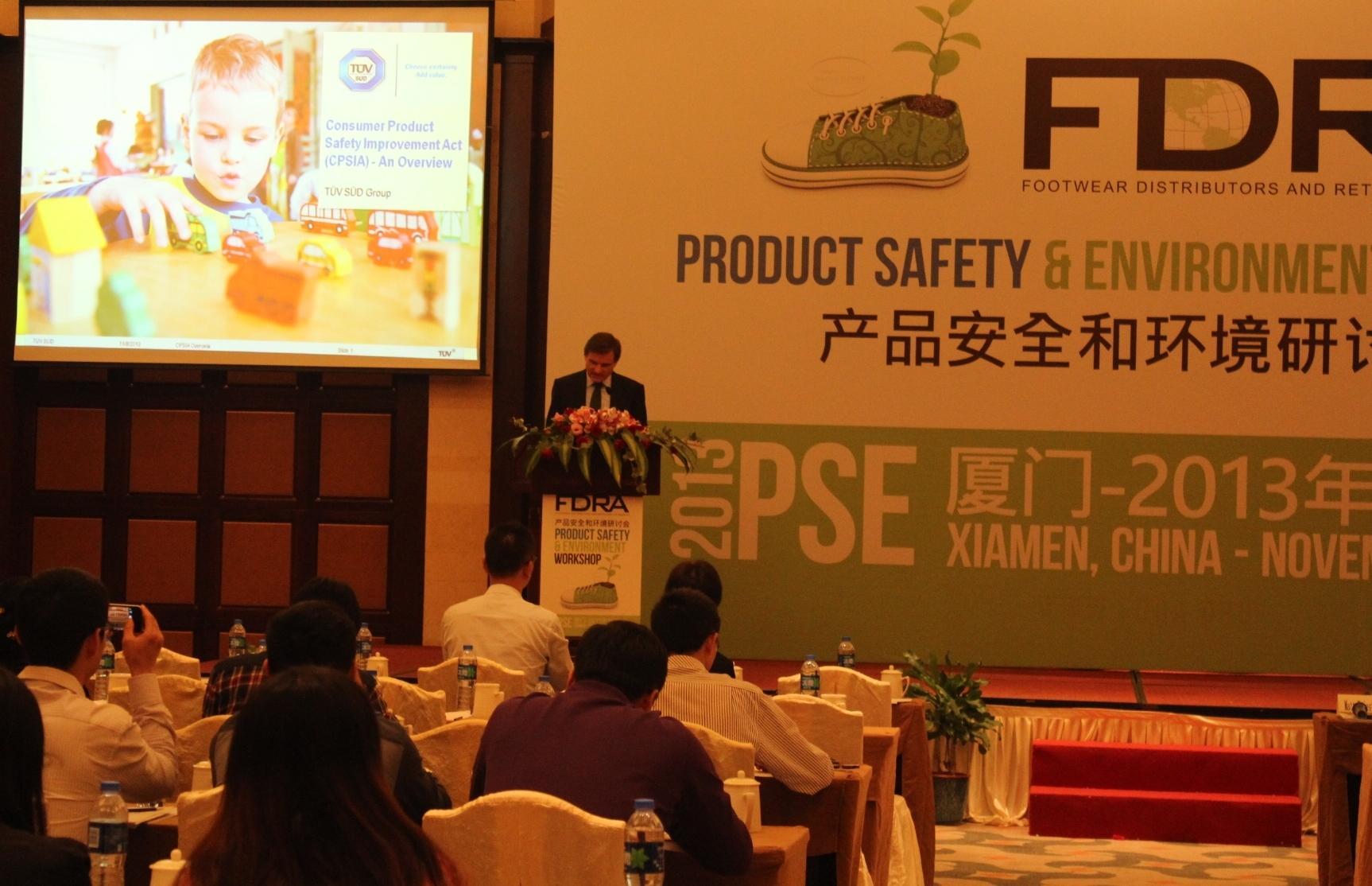 廈門2013年11月8日電 /美通社/ -- TUV南德意志集團(以下簡稱 TUV SUD)聯合美國規模較大的鞋業行業協會 -- Footwear Distributors and Retailers of America (以下簡稱 FDRA) 在廈門共同舉辦 FDRA 產品安全與環境研討會 (PSE),本次研討會旨在向鞋業工廠管理層、采購、質控、產品研發部門人員,以及企業高層提供所需信息,以確保生產與材料的安全與可持續性。TUV SUD 大中華集團總裁兼首席執行官范華德(Dirk von Wahl)出席此次研討會并致辭。TUV SUD 大中華集團紡織品部總監雷家文博士,以及 TUV SUD 化學資深專家趙健先生和王慧女士,共同在現場與眾多企業代表一同分享鞋業產品安全的最新發展與較佳實踐。