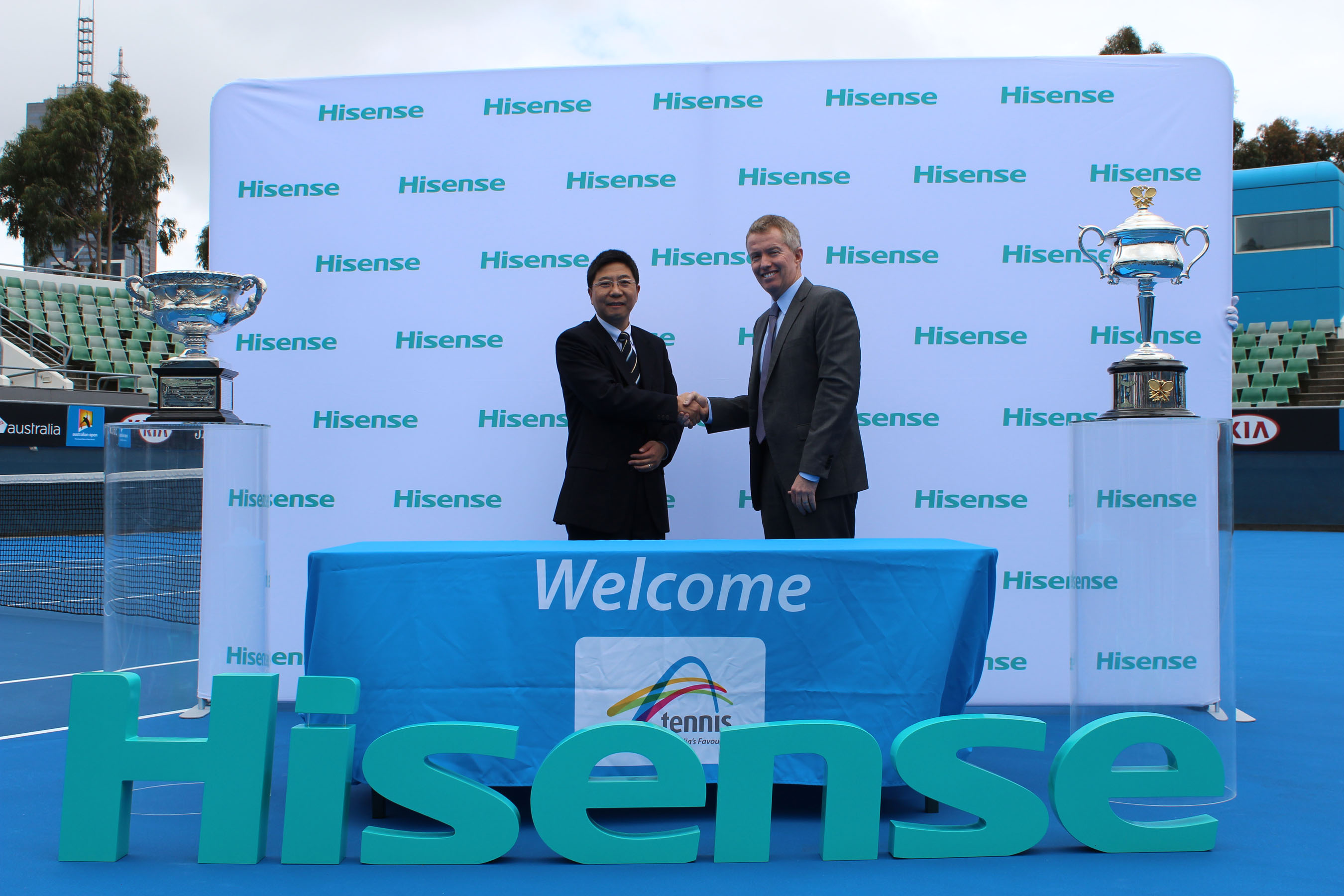 海信集團代表澳洲海信總經理柯龍涵與澳網CEO Craig在澳網比賽場地舉行了簽約儀式