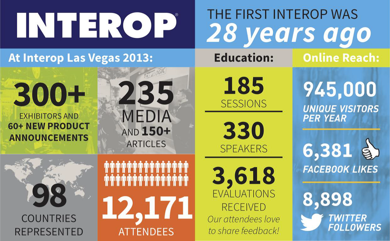 Interop Las Vegas是由全球第二大展覽公司UBM Tech 主辦的全球較大的網(wǎng)絡通信展會之一,距今已有28 年歷史。Interop 每年都吸引來自全球的數(shù)百家展商及專業(yè)媒體參與其中,分享最新的網(wǎng)絡通信業(yè)界動態(tài)。其中,Interop Las Vegas 2013 的參展商超過了350 家,主辦方邀請到330 位全球知名演講嘉賓共帶來185 場精彩演講,另外,來自98 個國家的12171 名與會者以及235 家專業(yè)媒體參與活動現(xiàn)場。Interop已經(jīng)成為業(yè)界公認獲取關于最新 IT 趨勢及更好見解的高效平臺,關鍵技術伙伴以及各行業(yè)市場參與者能獲得所需的合適解決方案。